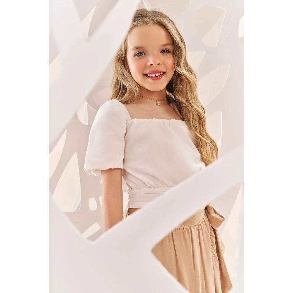 Un look fresco y encantador que combina una blusa de manga corta con una falda khaki. Perfecto para cualquier ocasión, con estilo y comodidad garantizados. ¡Ideal para las más pequeñas!