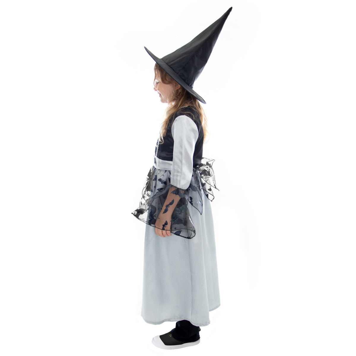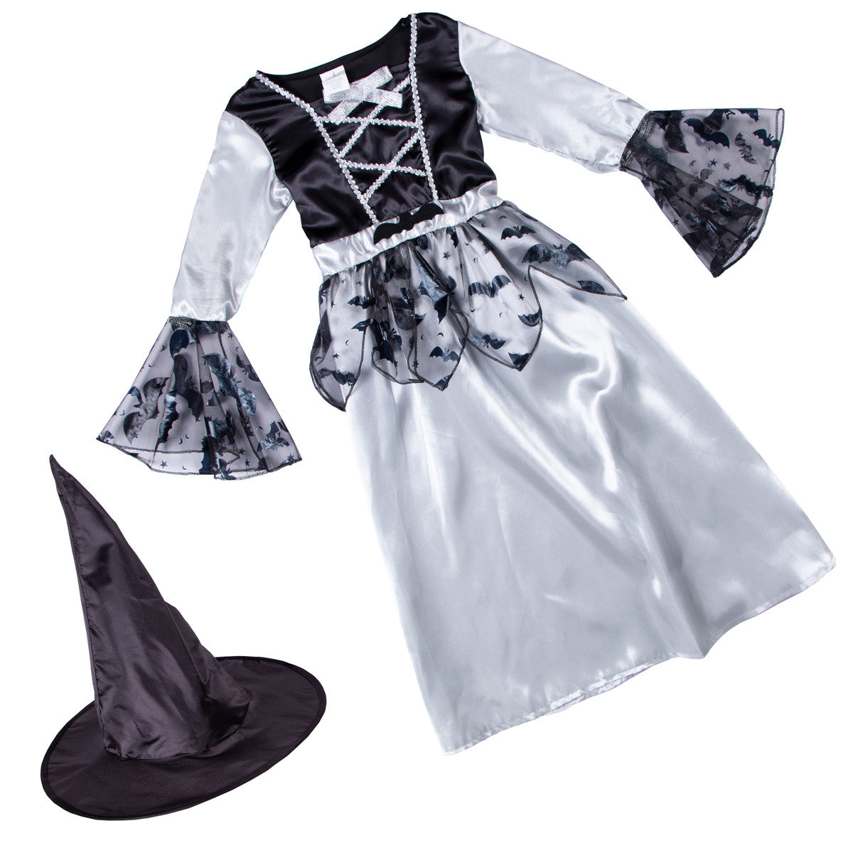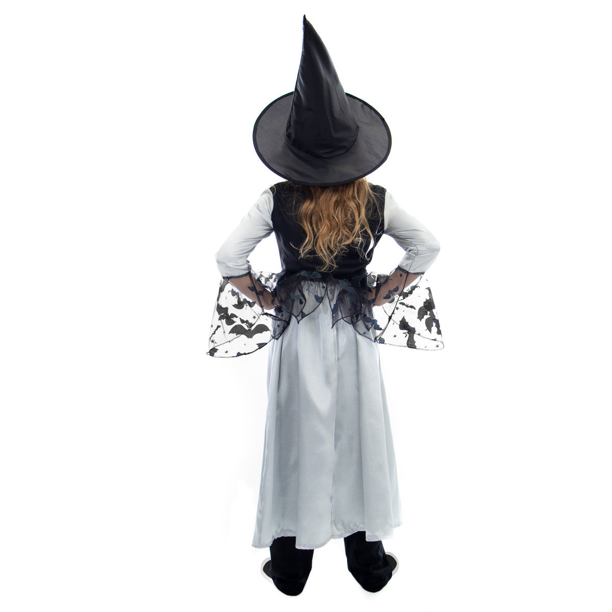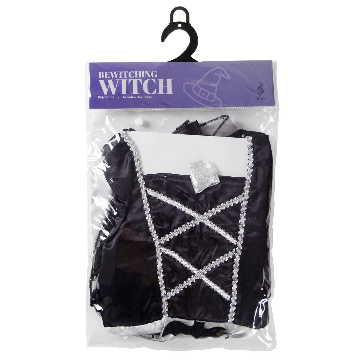 Bewitching Witch Costume When the vampire bats darken the night sky, prepare to cast your favorite icy spells in this spooky, modern Bewitching Witch costume. This Boo costume comes with a black and silver dress, as well as a classic black hat to help complete your child's wicked look. Wear this for Halloween trick-or-treating, theme parties, and costume contests. Collect all the candy you can, but save some for your mummy. And when Halloween comes to an end, dress up and play pretend all year round. You're in for a spooktacular treat with this classic costume This girl's costume is made with 100% polyester, no hocus pocus materials. Accidentally got some eye of newt on your clothes. Hand wash your eerie outfit and hang it out to dry. To prevent colors from bleeding, avoid bleaching or ironing this attire.