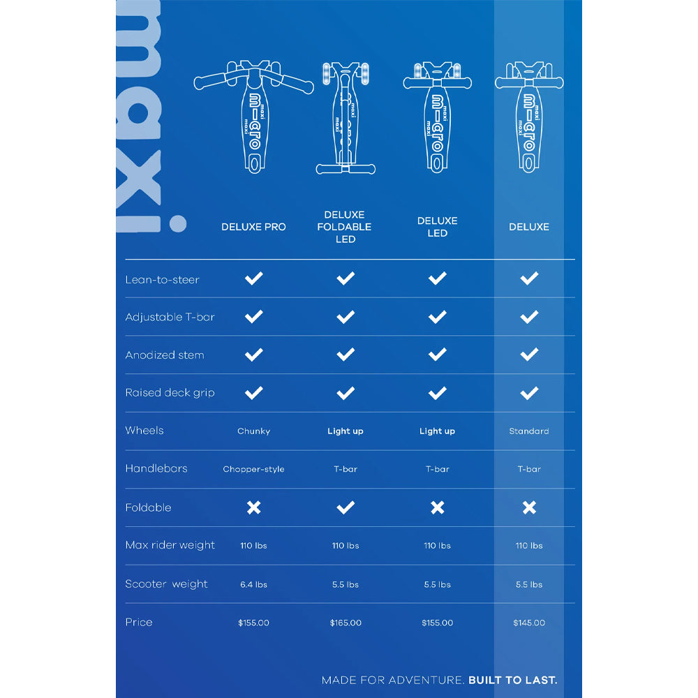- El patinete Maxi Deluxe está diseñado para niños de 5 a 12 años, hasta 110 libras. El estilo de patineta de Micro brinda a los ciclistas jóvenes una estabilidad excepcional a medida que los ciclistas más jóvenes comienzan a dominar sus habilidades, mientras que los niños mayores se curvan y tallan la acera con confianza mientras cambian el peso de su cuerpo de un lado a otro.