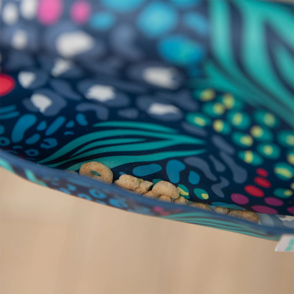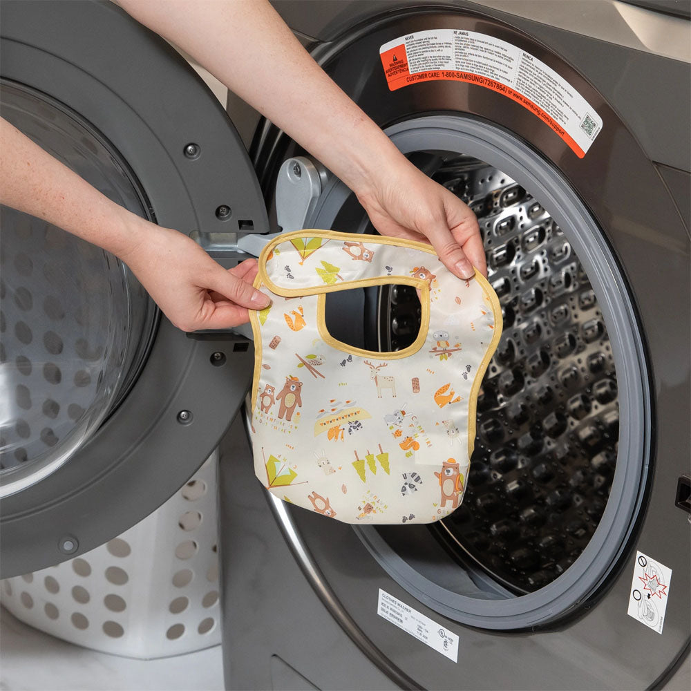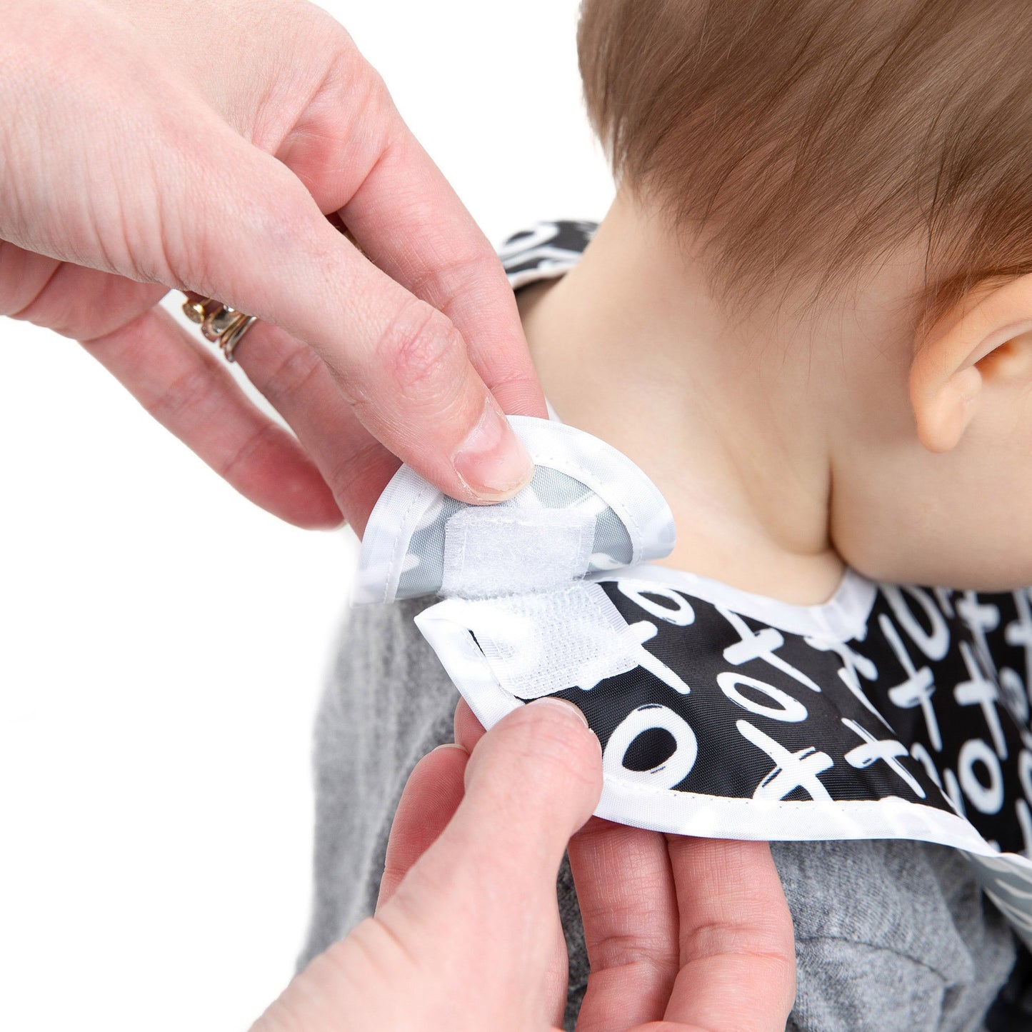 Our Starter Bibs save you from the mess! Perfect for baby's first foods, the Starter Bib attaches over the back of the shoulder with hook and loop for a quick, adjustable and tug-proof fit. With a handy crumb catcher / catch-all pocket for containing spills. Made from Bumkins lightweight, waterproof, easy-wipe, stain and odor resistant fabric. Single ply construction means no worrying about icky stuff growing between layers of fabric. Without a cotton layer, stains and smells don't stick. Wipeable and machine washable for easy cleaning so you can use it over and over again! The pack of 2 ensures you have a clean one handy.