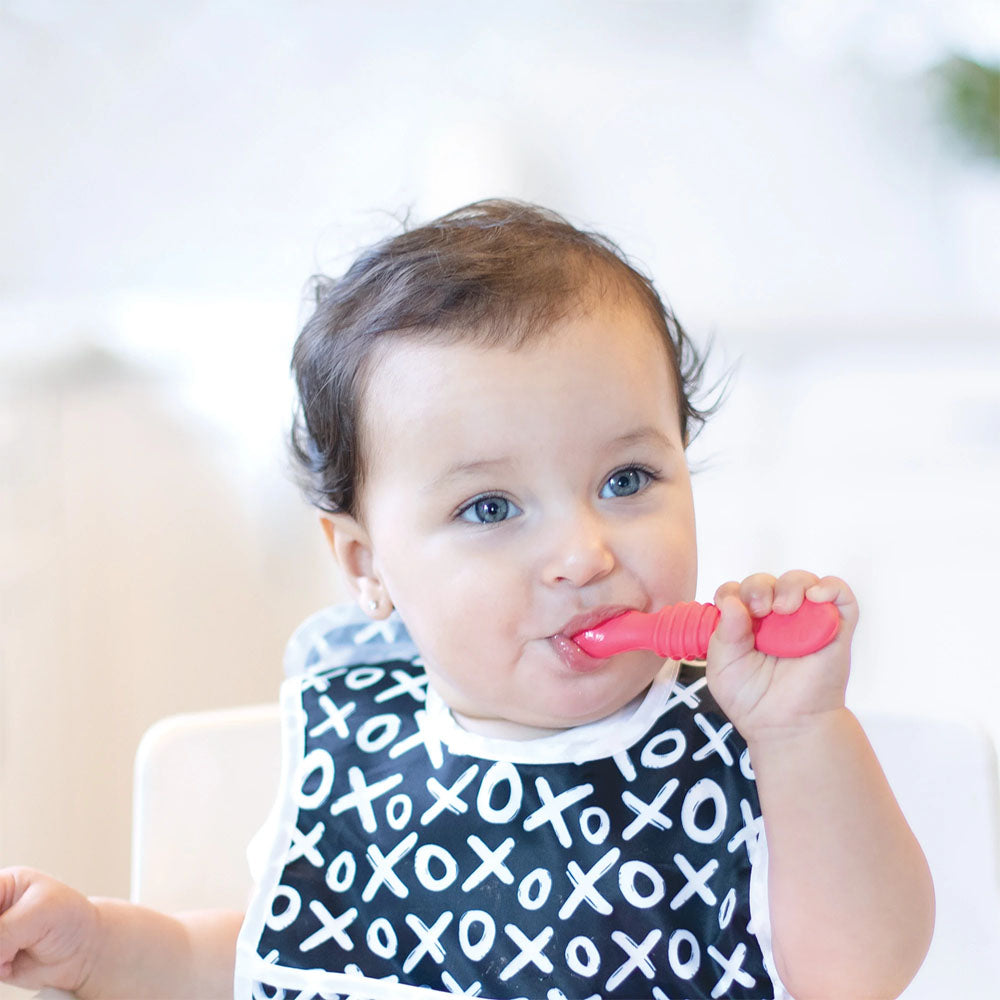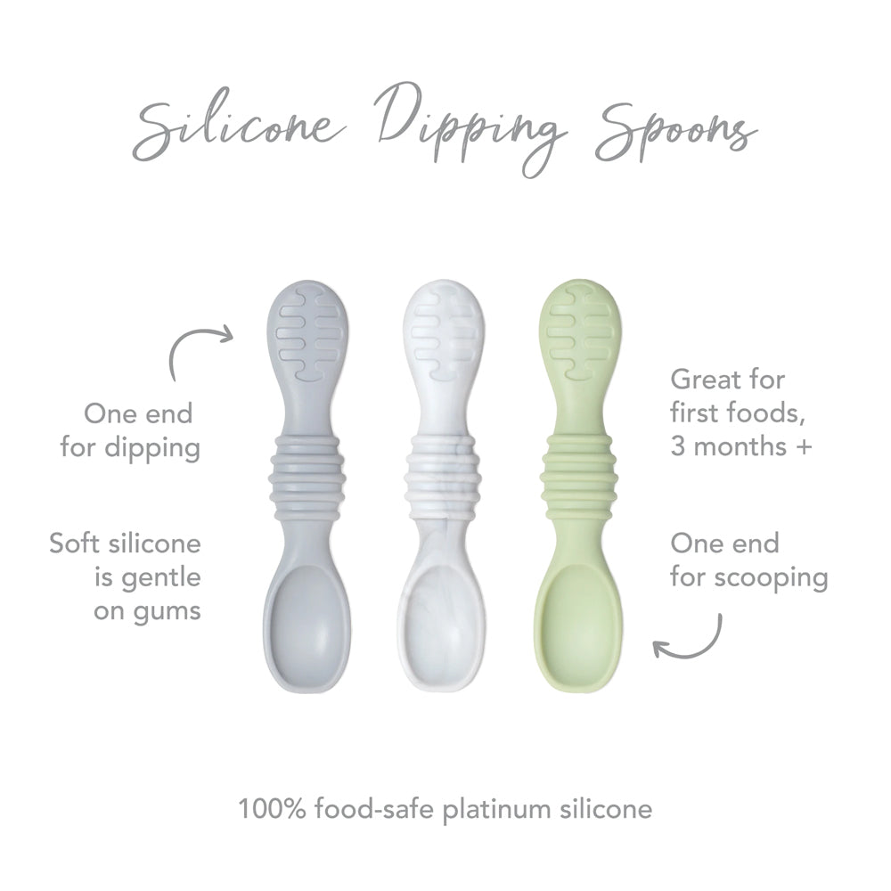 Introduce baby to the world of self-feeding and utensils with this set of starter spoons. Made from 100% food-safe silicone that is gentle on gums, Silicone Dipping Spoons are double-ended to grow with baby—one side for dipping into purees, the other for scooping. Silicone Dipping Spoons are the ideal size for baby to begin the motions of self-feeding while under the supervision of an adult. With three spoons in a set, there are enough for both parent and baby to have a spoon in hand, avoiding any power struggles with independent eaters. Spoons can be used with the Bumkins Silicone First Feeding Set or separately. Easy to clean by hand and dishwasher safe.