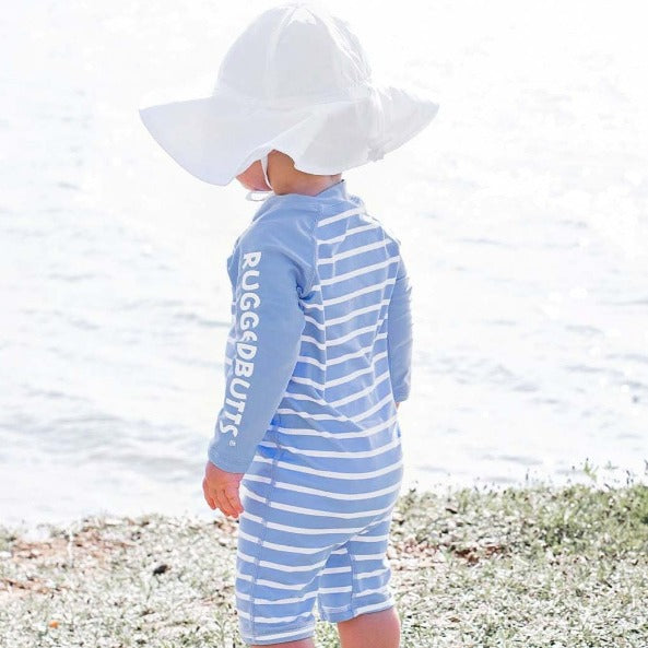 Keep him or her cool and protected from the sun's rays in this UPF 50+ sun protective bucket hat. Made of light-weight fabric and held secure with comfortable straps to tie under his chin, this hat is perfect for little busybodies!