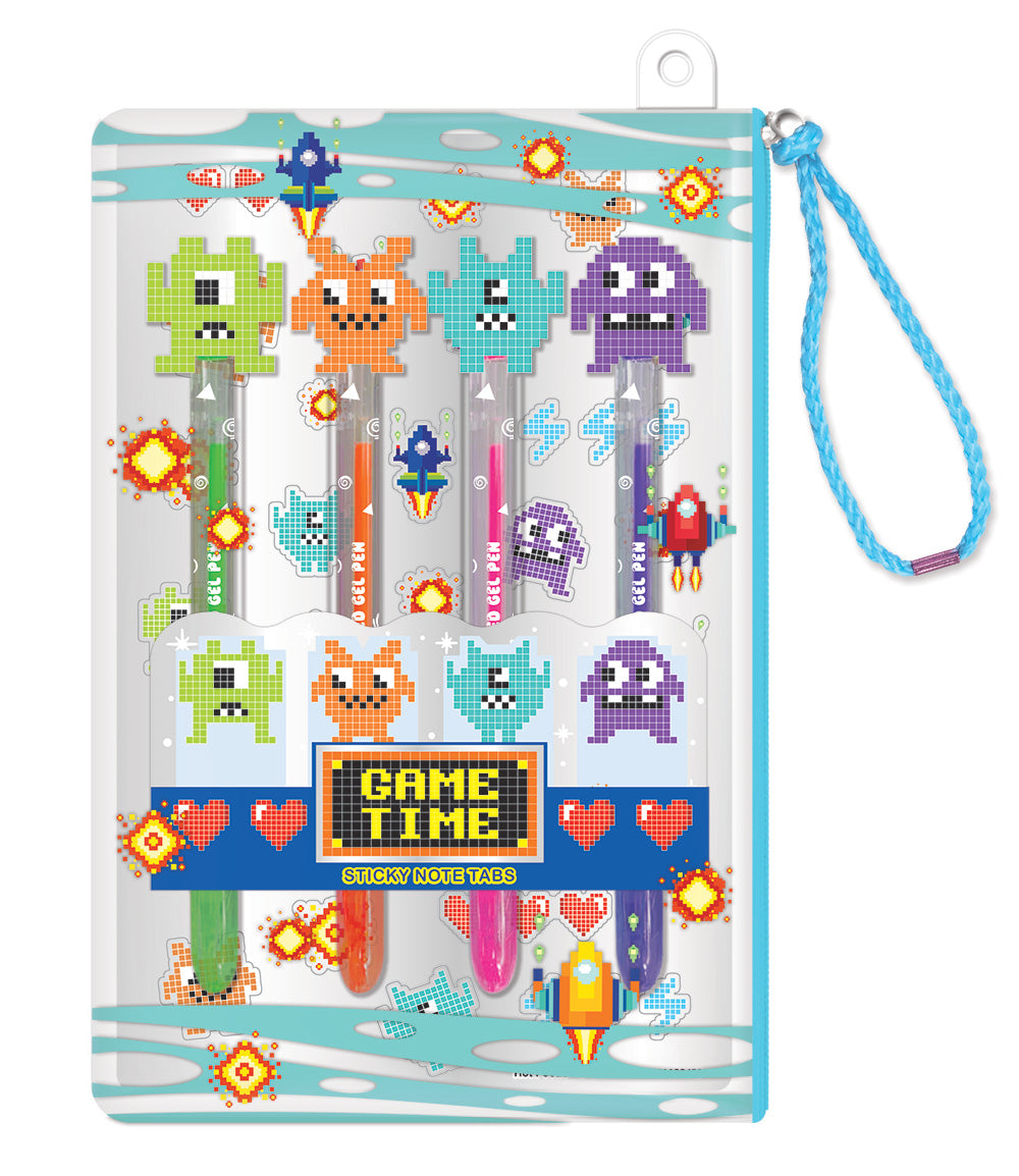 EL juego de bolígrafos más cool y divertido para escribir tus apuntes y notas, incluye una lapicera transparente, 4 bolígrafos de gel perfumados, 4 notas adhesivas de diferente diseño y 1 hoja de etiquetas adhesivas para adornar tus notas y objetos favoritos. Todo con diseño de divertidas figuras en pixeles.