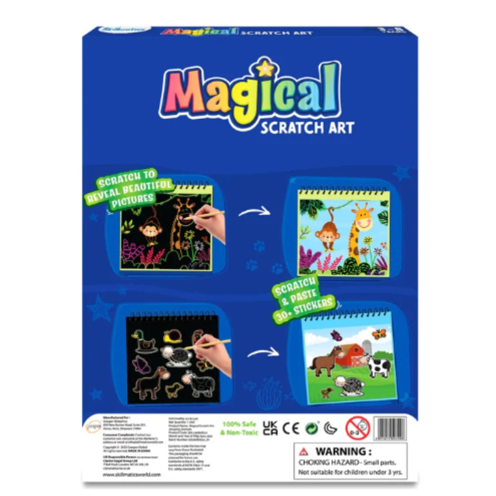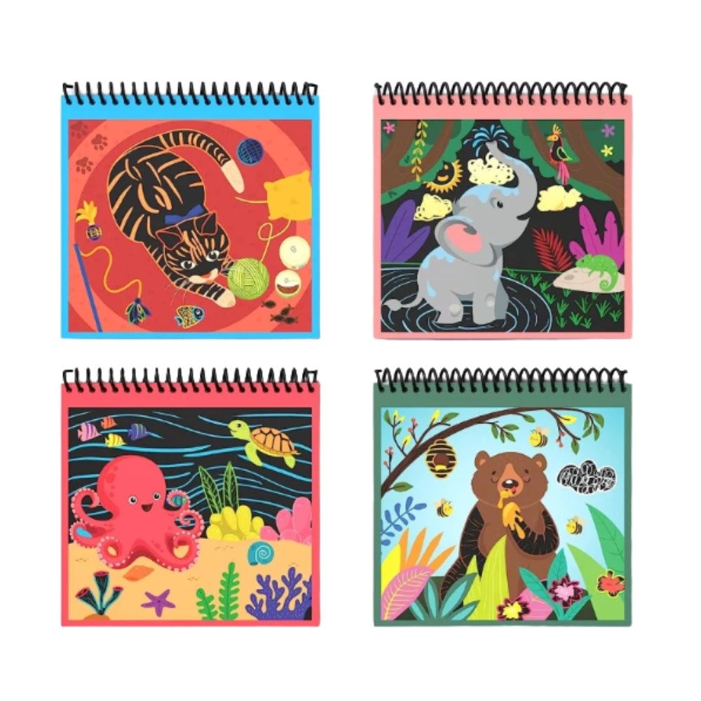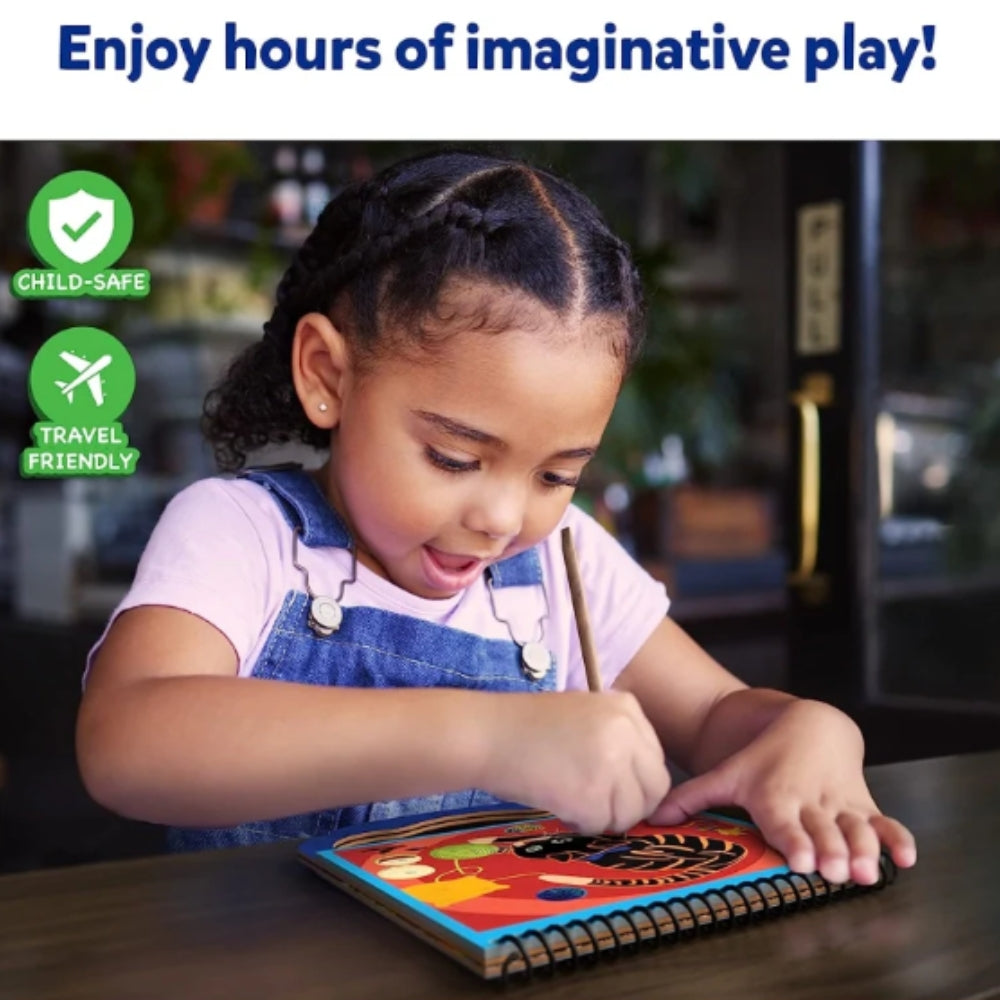 Unleash your creativity by scratching the black art paper with a wooden stylus to reveal a colorful world waiting underneath. Add to the magic by creating and adding unique scratch-art stickers of animals found in the wild, on the farm and underwater!