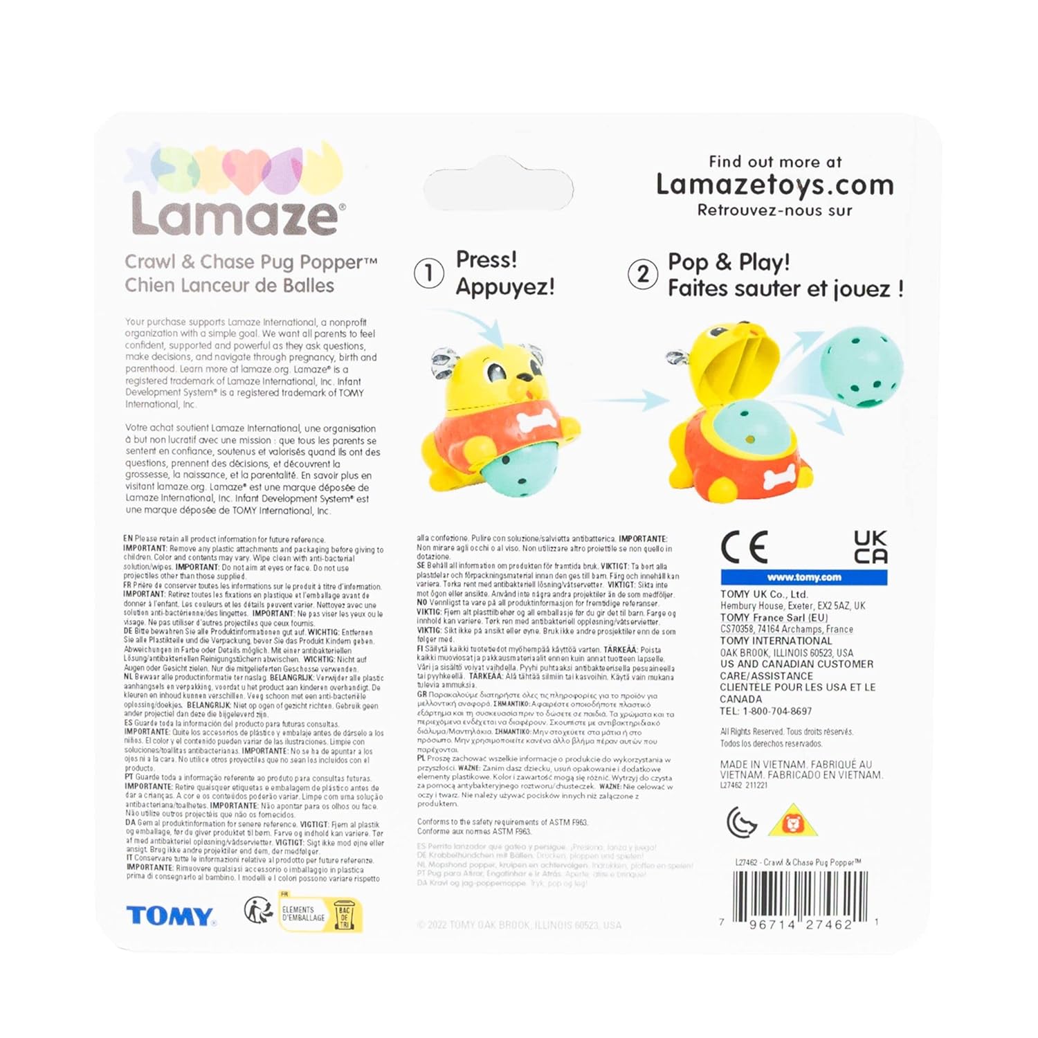 The LAMAZE Crawl & Chase Pug Popper Sensory Development Toy is an adorable pug that wants to play fetch with your little one. Press the pug down on one of the two colored balls, and watch as the ball leaves its mouth to roll across the room. Babies can't help but laugh while chasing the ball, and then they'll be excited to do it all again. The balls feature multiple open dimples that make them easy for little hands to grasp while helping to strengthen fine motor skills while playing. This cute dog toy is also the perfect friend to encourage gross motor skills and active movement as toddlers chase rolling balls. There's no better way to share your love, bond with your child, and help them feel safe than playing together, and the LAMAZE Crawl & Chase Pug Popper offers you an engaging way to do so while playing with their puppy friend. It's a wonderful baby gift to give to the active little one in your life. Give them the gift of early learning and discovery!