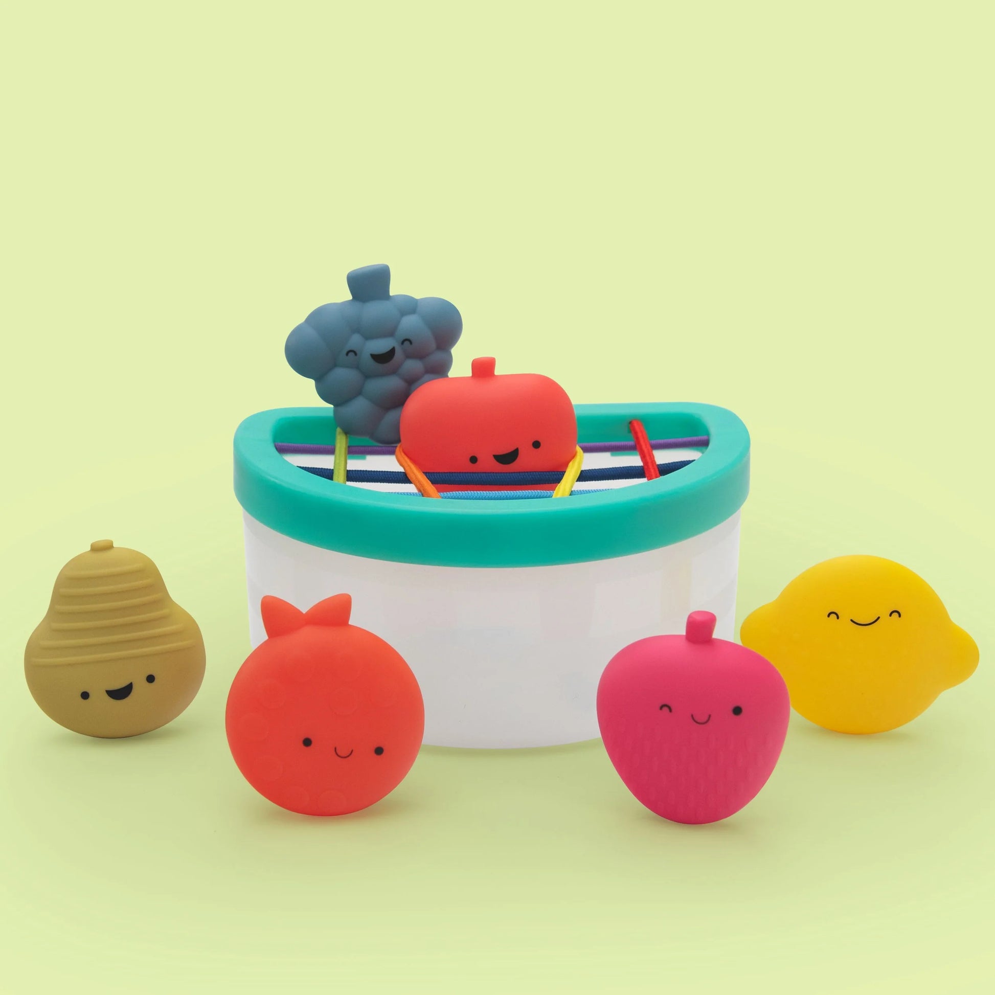 - Use the fruit pieces and the container without the lid for simple in and out play, an activity that supports your baby's developmental growth