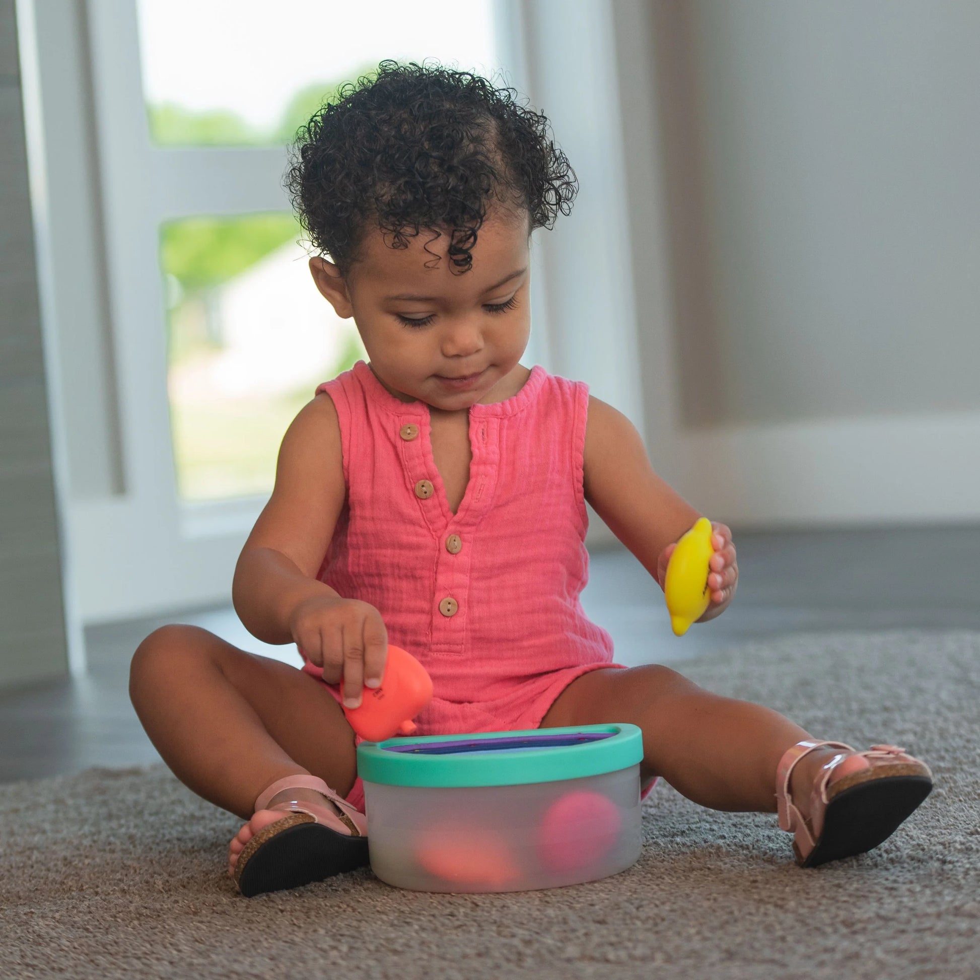 The Sassy Fruit Fill n' Spill has textural fruits, learn each fruit’s shape and color, and fill up the container to spill out the contents. Filling & spilling is a developmentally appropriate activity for baby to practice fine motor skills. As baby grows, use the lid as to challenge baby to push the fruits through the elastic bands. The fruits are textured and soft for baby to mouth and explore for tactile development.