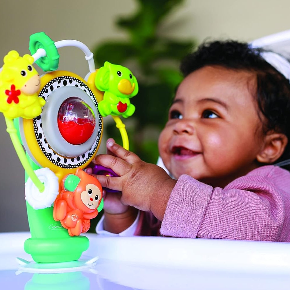 What's more, this spinner comes with an attached suction cup for stability during play. It steadfastly affixes to any smooth surface such as high-chairs, stroller trays, or tables, bringing joyous fun even on the move.