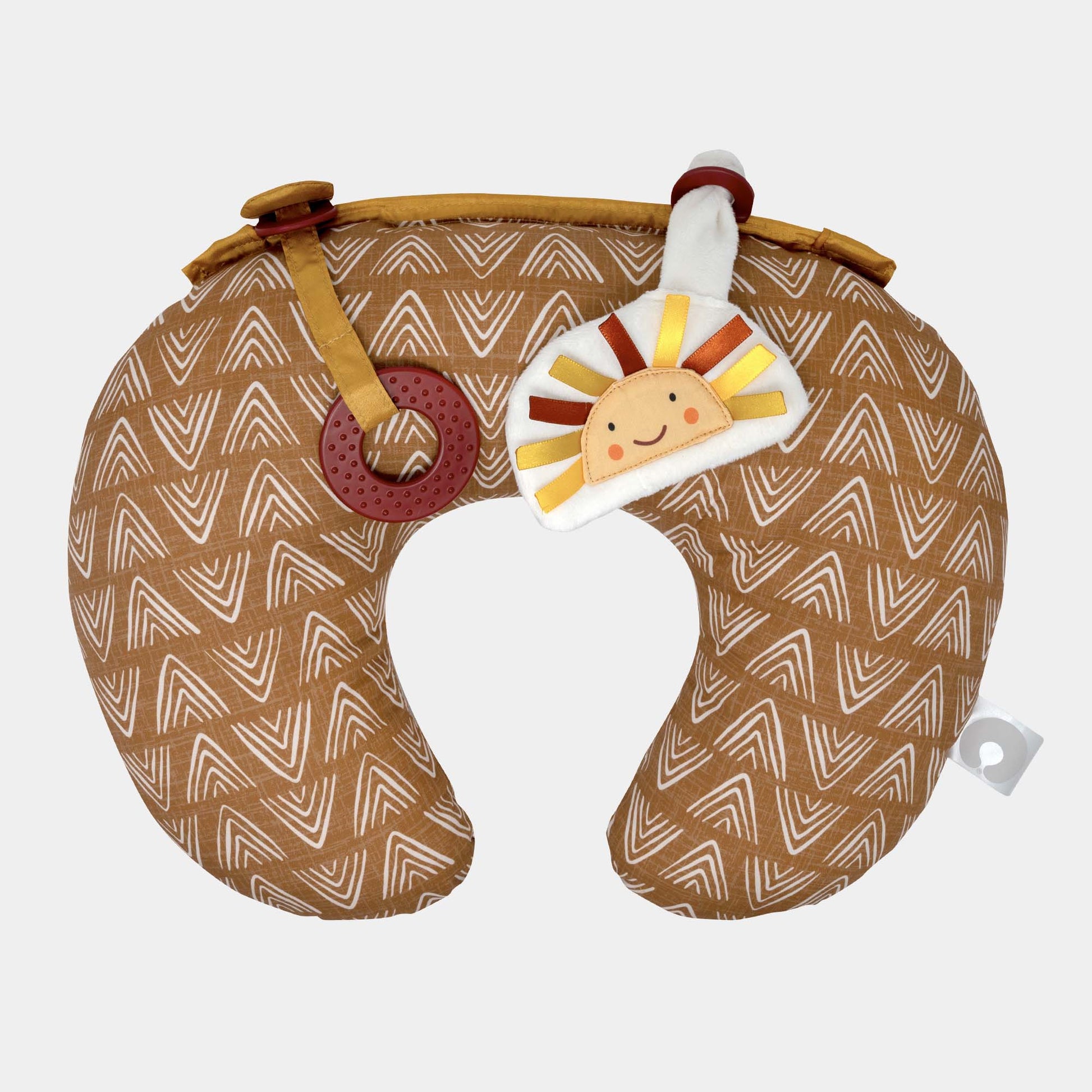 The Boppy Tummy Time Prop integrates Boppy’s patented SlideLine system to attach toys to make tummy time more fun. Leave on the included plush crinkle toy and teething ring provided or swap out for baby’s favorites to encourage longer and more active tummy time.