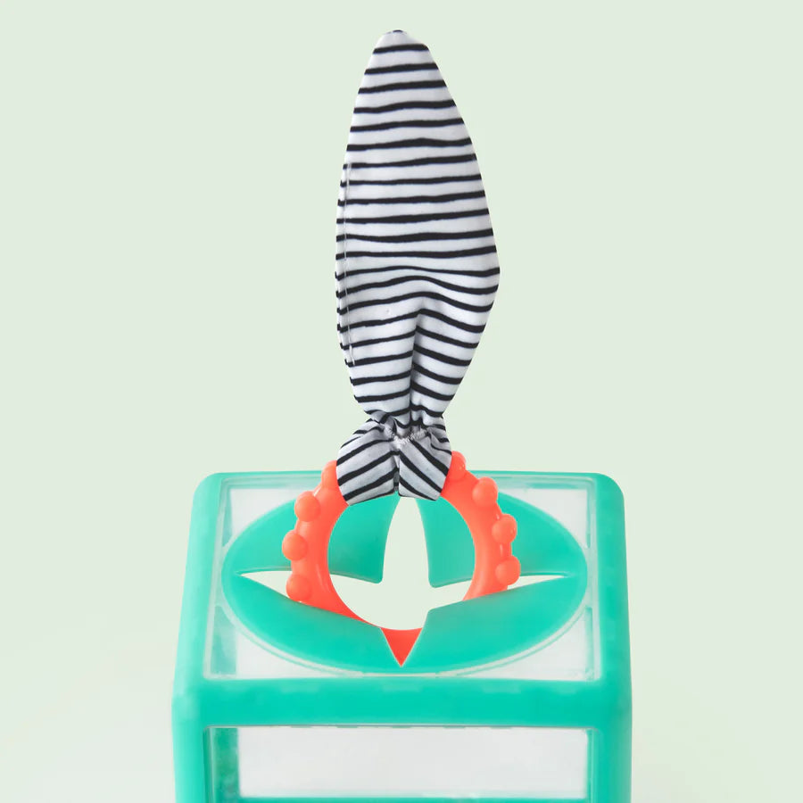 Babies love playing with tissue boxes, so this can be their very own! Clear box with soft top flap opening, to put & take rings with crinkle fabric. The rings are textured and great teethers! Easy to grasp rings have a bold patterned crinkle fabric attached to each for a sensory experience. Name the colors as you put them in the box, and the crinkle fabric will help pull the ring out! Each side of the box visually shows something different – a clear panel, a frosted panel, a striped panel, and a magnified panel. Encourages fine motor skills, tactile exploration & experimentation