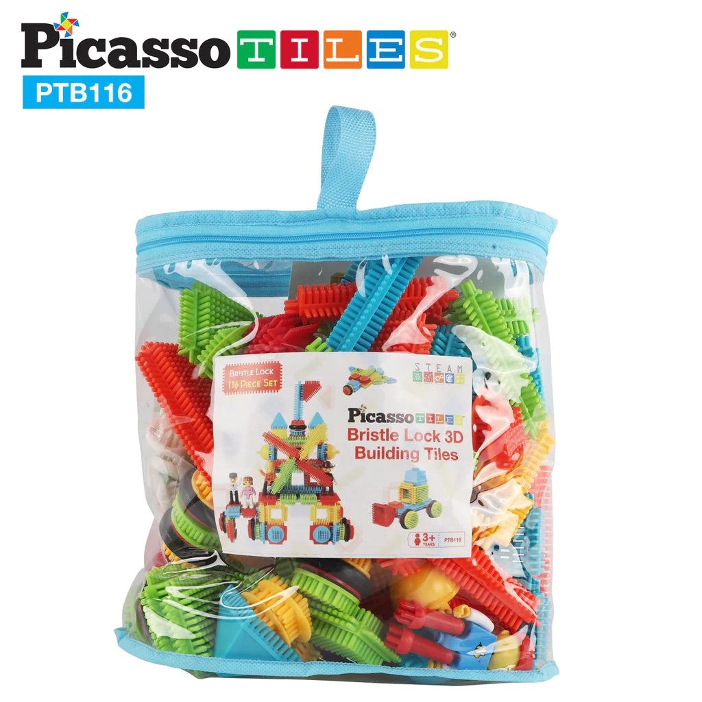 The PicassoToys PTB116 play set hedgehog brush shaped blocks are hand stimulating, soft, rubbery, interlocking hedgehog shapes that stick together at any angle makes it easier to build and comes with an idea book that includes more than 30 builds to kickstart any kids, youngsters, toddlers, preschoolers, boys, or girls and jump right into the constructive plays. The open-ended play facilitates to develop children's creativities at a young age. PicassoTiles educational STEM STEAM toys offer children opportunities to acquire strong sense of number counts, colors, geometrical shapes, and architectural engineering designs with endless building possibilities of different structure objects such as cars, houses, castles, robots, etc... and highly compatible with other toys. No limitations, scalable to build as big as desired by adding more pieces to create a masterpiece. PicassoTiles in colossal styles.
