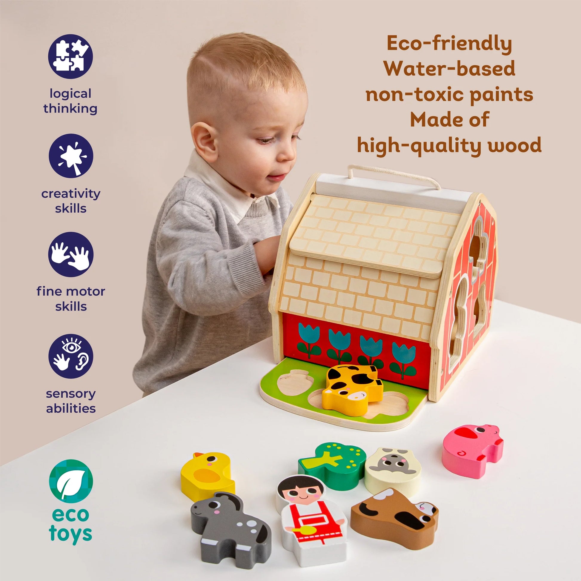 - 10 piezas de clasificación únicas : incluye 6 animales de granja, un granjero y otras formas con temas de granja para combinar con sus ranuras designadas.