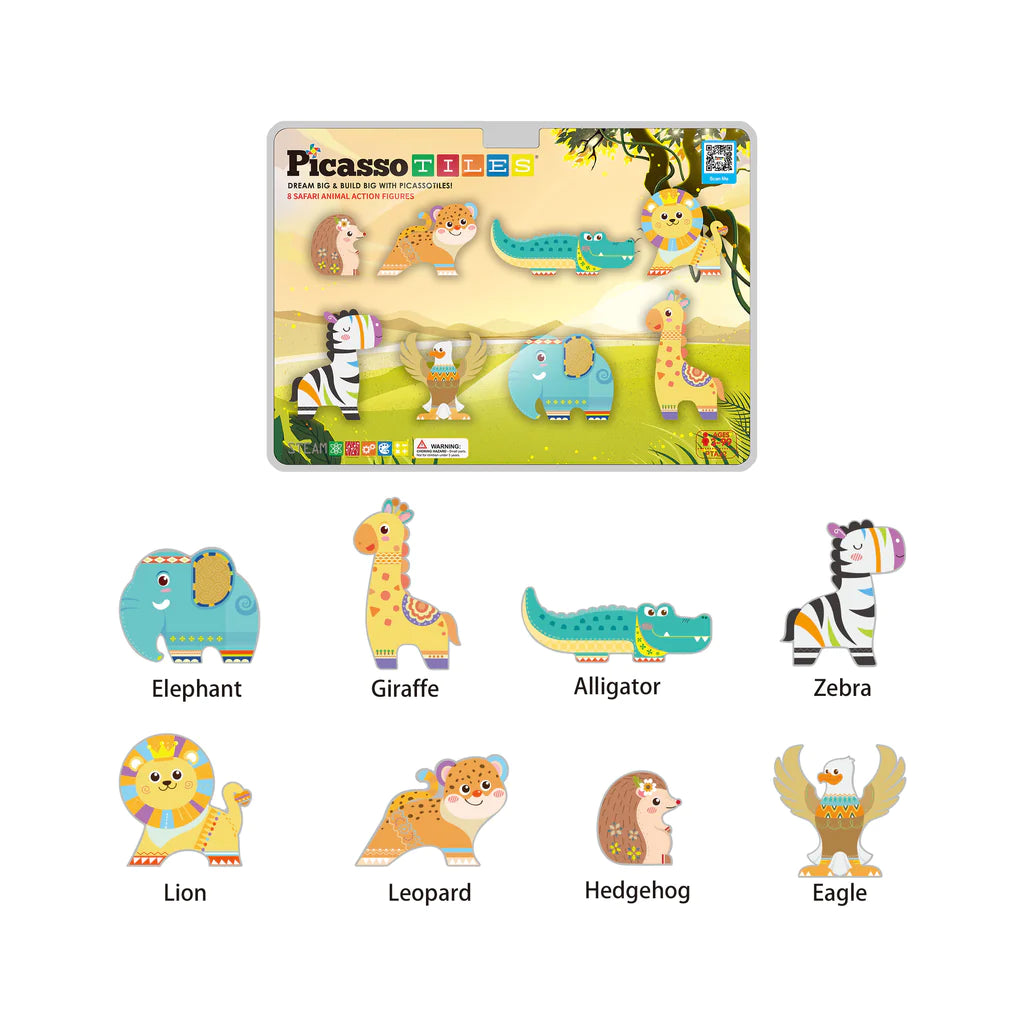 PicassoTiles 8pc Magnet Building Blocks 8 Safari Animal Magnetized Action Figures Compatible with Magnetic Assembly Build Tile Toys Accessory Toyset STEAM Educational Learning Girls Boys Ages 3+ PTA22