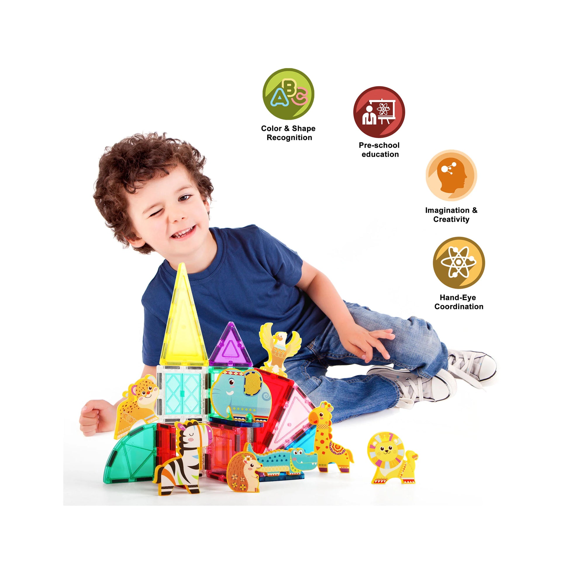 LEARNING BY PLAYING: Nurturing being creative through hands-on exploration is the key to success in STEAM education. Our safari magnet add-on action figures elevates the Science, Technology, Engineering, Arts, and Mathematics intellectual journey while providing storytelling fun. Construct these magnetic toys with magnetized building tiles to fine-tune hand-eye coordination, color and shape recognition. Enhance preschool knowledge with the combination of imagination and creativity.