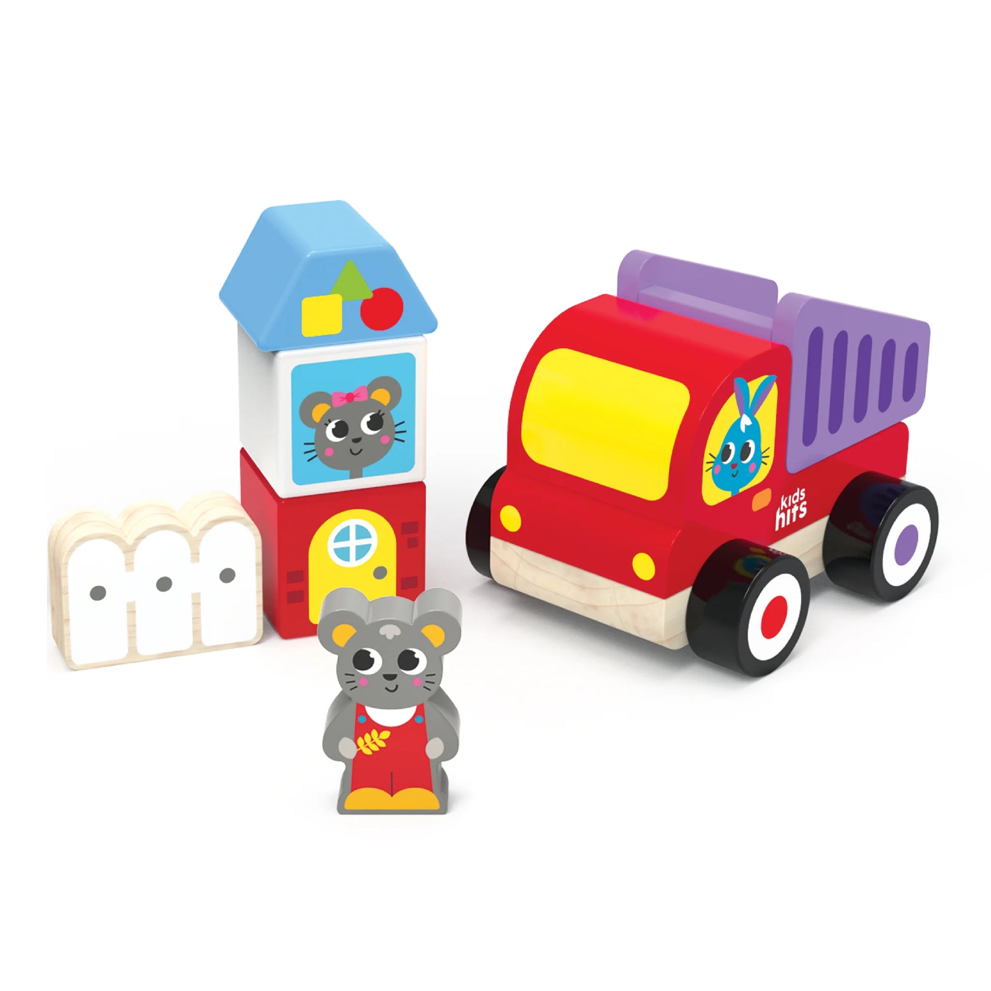 Get ready for a world of imaginative play with our Wooden Dump Truck Building Set! This colorful set features a lively dump truck with a workable dumper body and easy-to-roll wheels, perfect for little hands. Toddlers will delight in pushing and pulling the truck, loading and unloading its tipper body, and constructing a house with the included blocks.