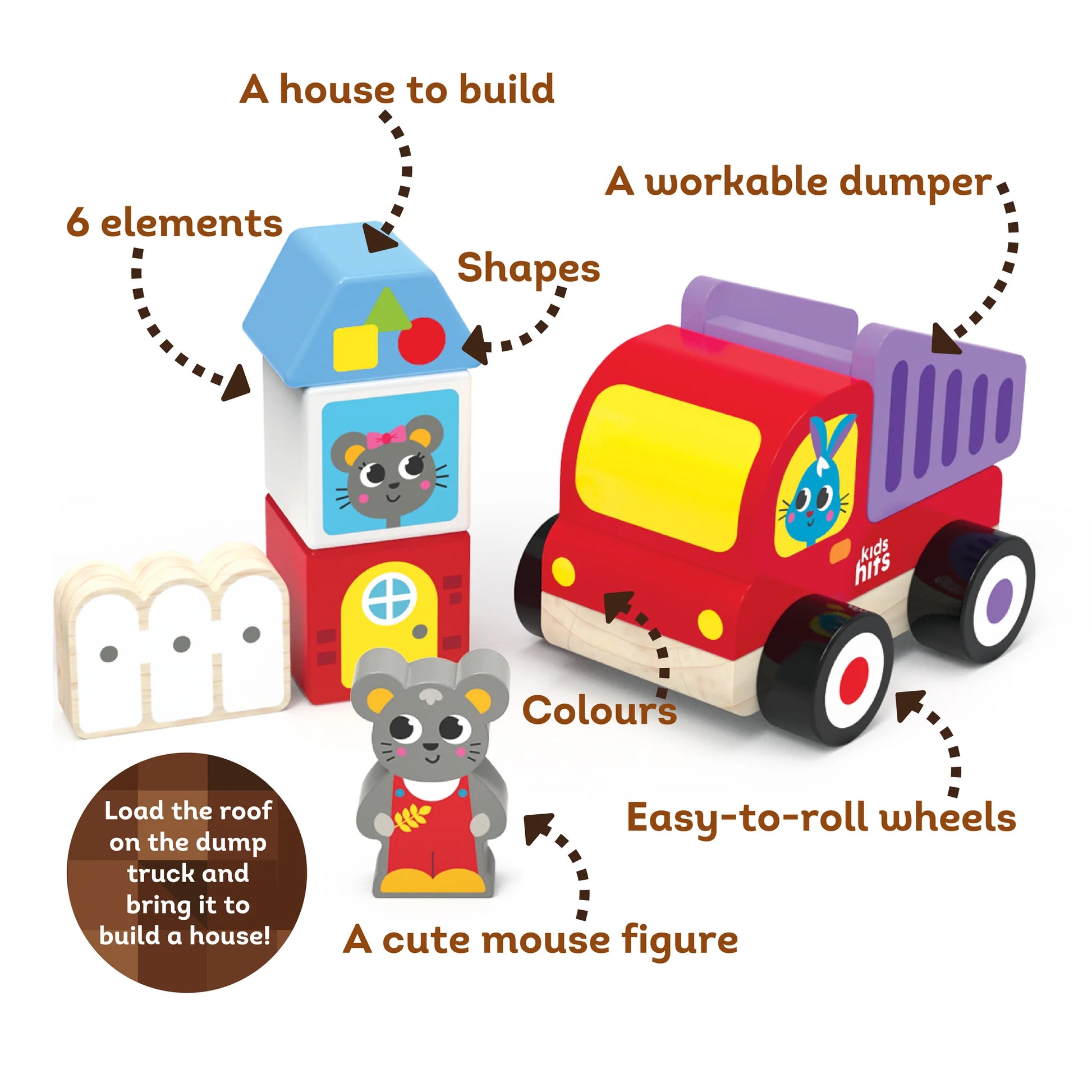 ¡Prepárate para un mundo de juego imaginativo con nuestro set de construcción de camión volquete de madera ! Este colorido set incluye un camión volquete con una carrocería práctica y ruedas fáciles de mover, perfecto para las manos de los más pequeños. Los niños pequeños se divertirán empujando y tirando del camión, cargando y descargando su volquete y construyendo una casa con los bloques incluidos.
