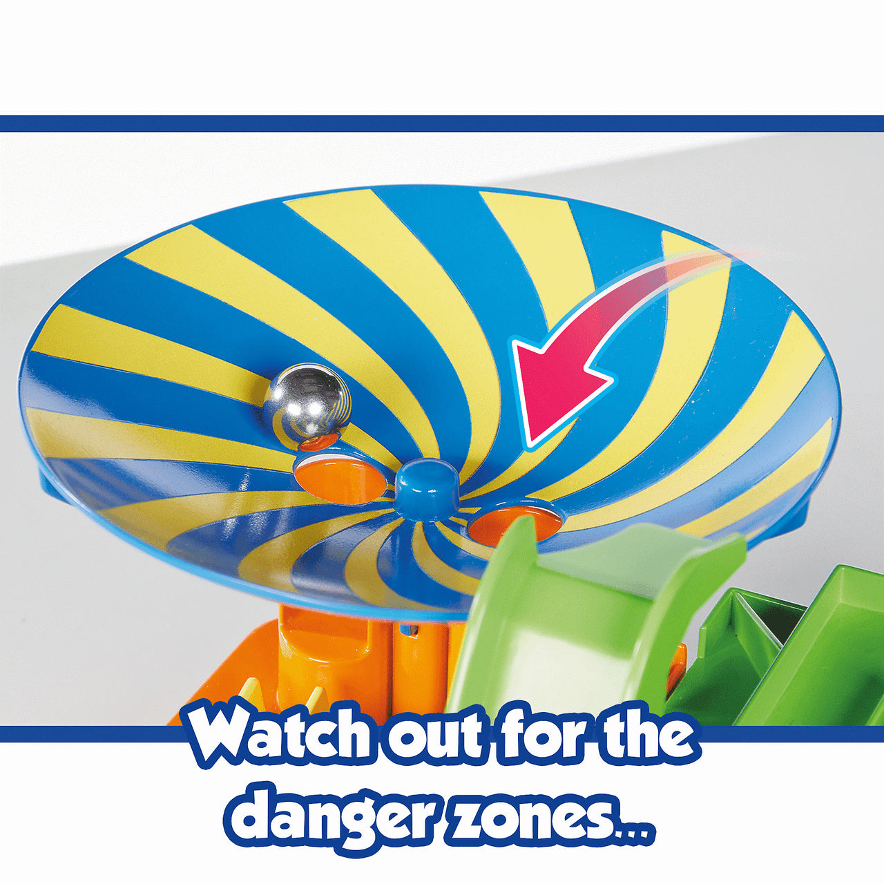 Desde alocados escalones en zigzag hasta un fantástico laberinto con ruedas de la fortuna, y desde el alocado desafío del tirabuzón hasta una explosión de catapulta y mucho más, ¡es un circuito salvaje lleno de diversión para conquistar antes de que suene la campana de llegada! ¡Juega solo o enfréntate a familiares y amigos en las noches de juegos! ¡El que atraviese el laberinto más rápido gana!
