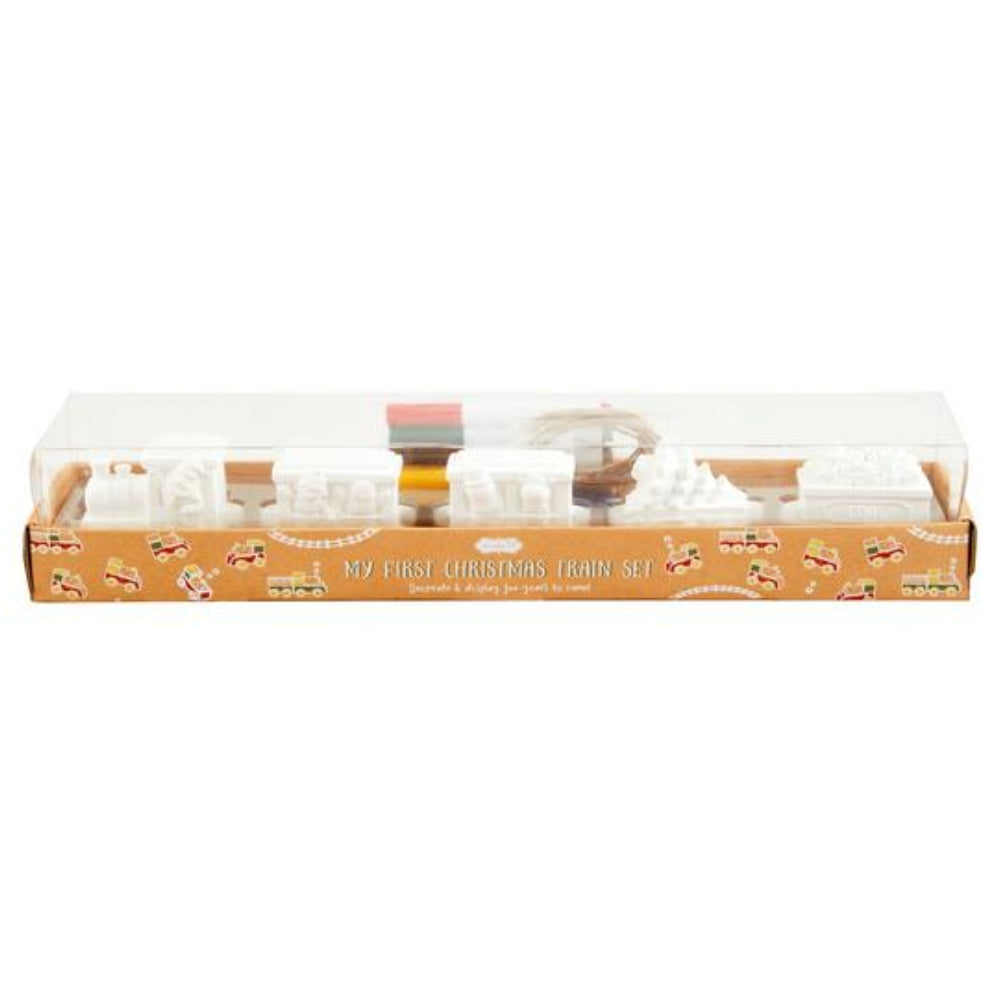 The Christmas Color-Me Train Set is a delightful 6-piece set that allows children to unleash their creativity. This set includes five plaster train cars that are ready to be personalized with the included pack of markers. Once decorated, the train set can be proudly displayed for years to come, making it a cherished holiday decoration. This set is suitable for children ages 3 and up, and each train car measures " x " in size. Let your child's imagination run wild with this festive and fun Christmas train set.