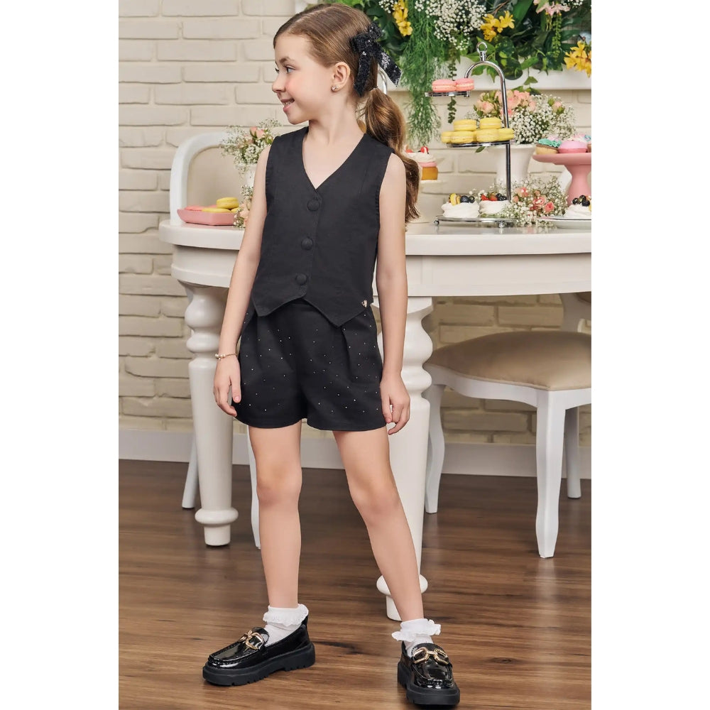 The vest complements the shorts, creating a practical and versatile outfit that's easy to mix and match with other pieces.