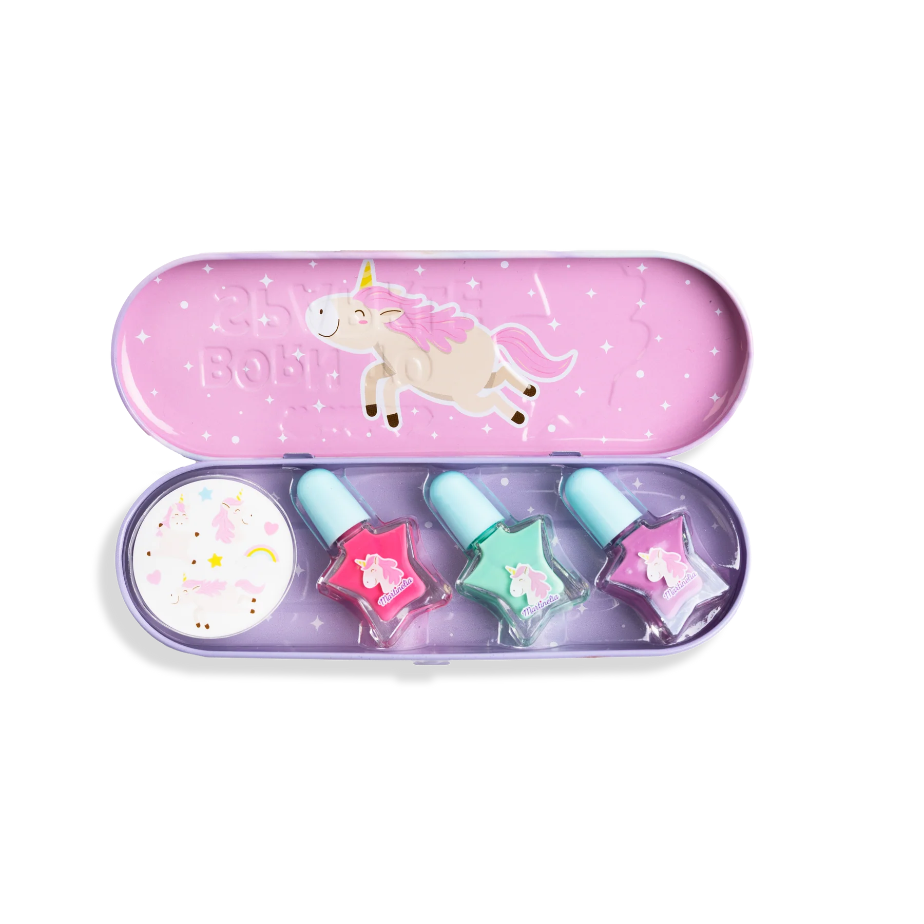 This reusable metal box contains the essentials for a colorful manicure. Includes 3 nail polishes and stickers, featuring unicorns, stars, hearts, and rainbows. It can also be used as a pencil case.