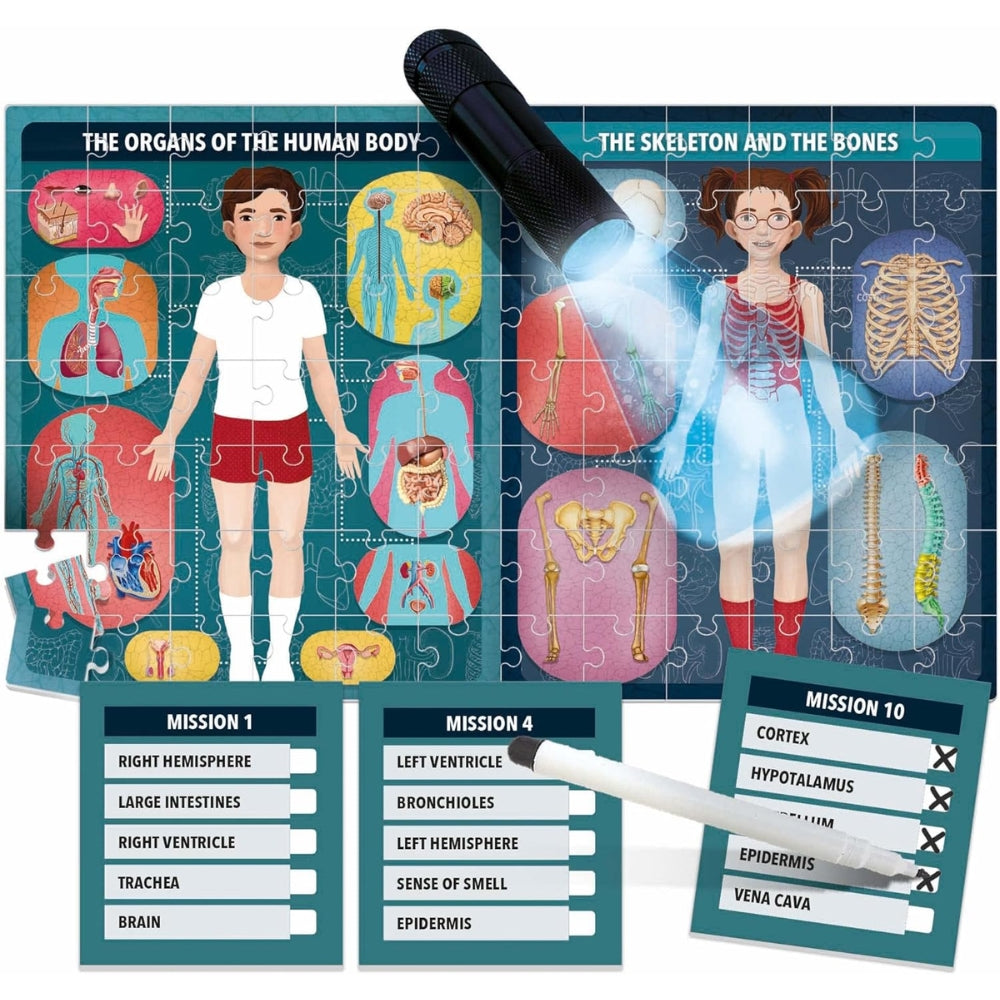 • WHAT'S IN THE BOX: This anatomy games for kids set includes an 84-puzzle pieces, erasable pen, 10 double-sided Mission cards, and a magic flashlight (runs on 3 AAA 1.5-v batteries, not included) for a comprehensive learning experience. It combines kids anatomy toys with learning. Science puzzle offers a rich, interactive experience. Assemble the jigsaw puzzle, then use the magic flashlight to reveal hidden elements and complete exciting missions with the included cards and erasable pen.