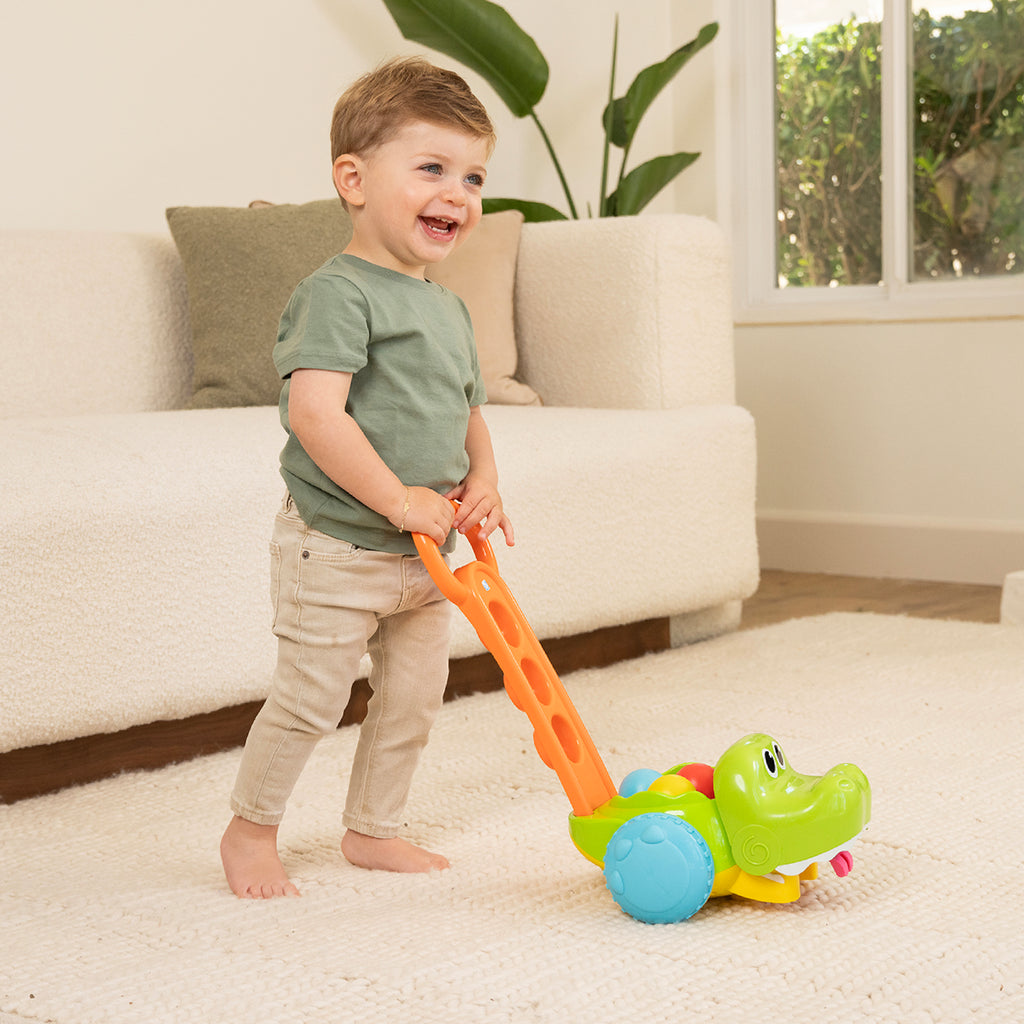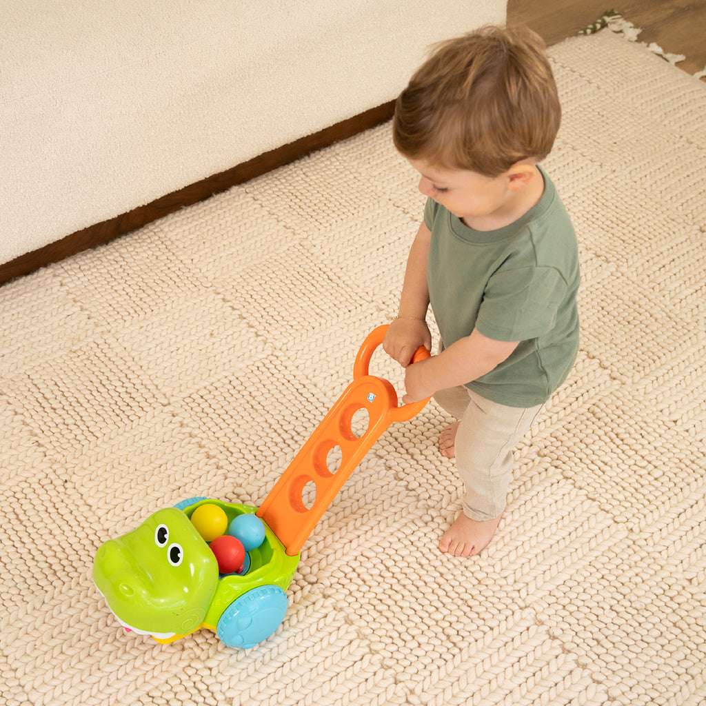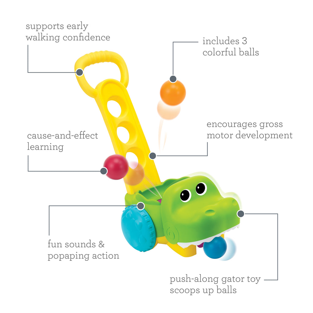 The Infantino Gator Scoot n' Scoop is a toy that encourages little ones to get moving. It's a crocodile-shaped walker that collects balls as the child pushes it. The push-and-collect motion promotes coordination, gross motor skills, and an understanding of cause and effect.