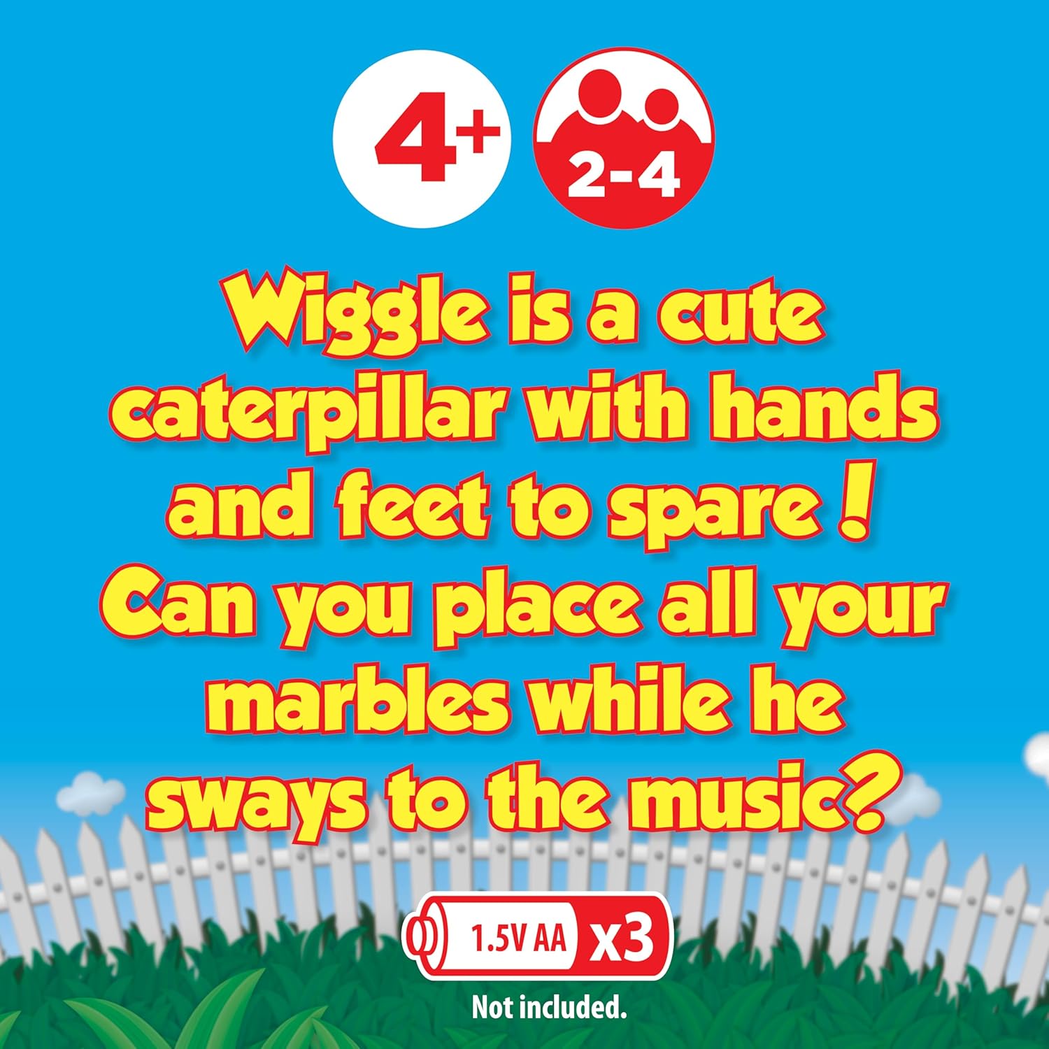 In the Box: This game comes with the adorable electronic caterpillar, 1 base, 28 colorful marbles, 1 sticker sheet, and instructions (Spanish language not guaranteed). 3 AA batteries not included.