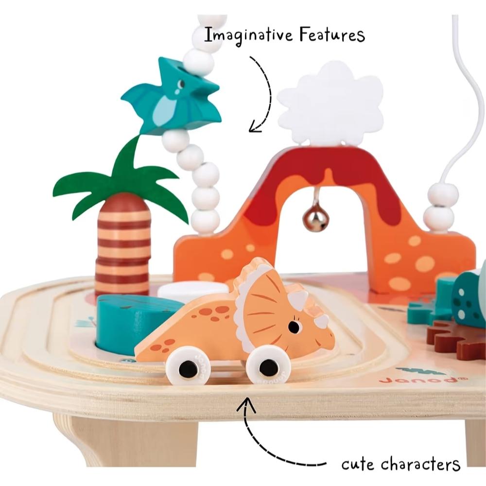 - Comprehensive learning table: 1 push dinosaur, 1 volcano with motor skills loop and bells, 3 palm pieces for stacking, 2 blocks for inserting, 1 rotating egg, 3 gears, 1 rotating mirror and 1 "crick" egg promise many hours of fun.