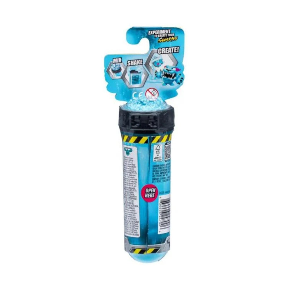 Añade agua al tubo de ensayo, agita bien y observa cómo emergen tus Swarms. Cada paquete doble contiene una guía de coleccionista, una bolsa de papel soluble, dos figuras, compuesto efervescente y un tubo de ensayo con tapa.