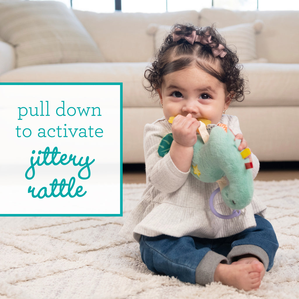 The Infantino Pull & Shake Jittery Pal – Dino is a sensory toy for babies that encourages play and exploration. This plush dinosaur is activated by pulling it: gently pulling it makes it vibrate and shake, making the baby laugh. It's made with fabrics of different textures and includes a variety of sensory surprises, such as crinkle sounds, an internal rattle, and a BPA-free silicone teether.