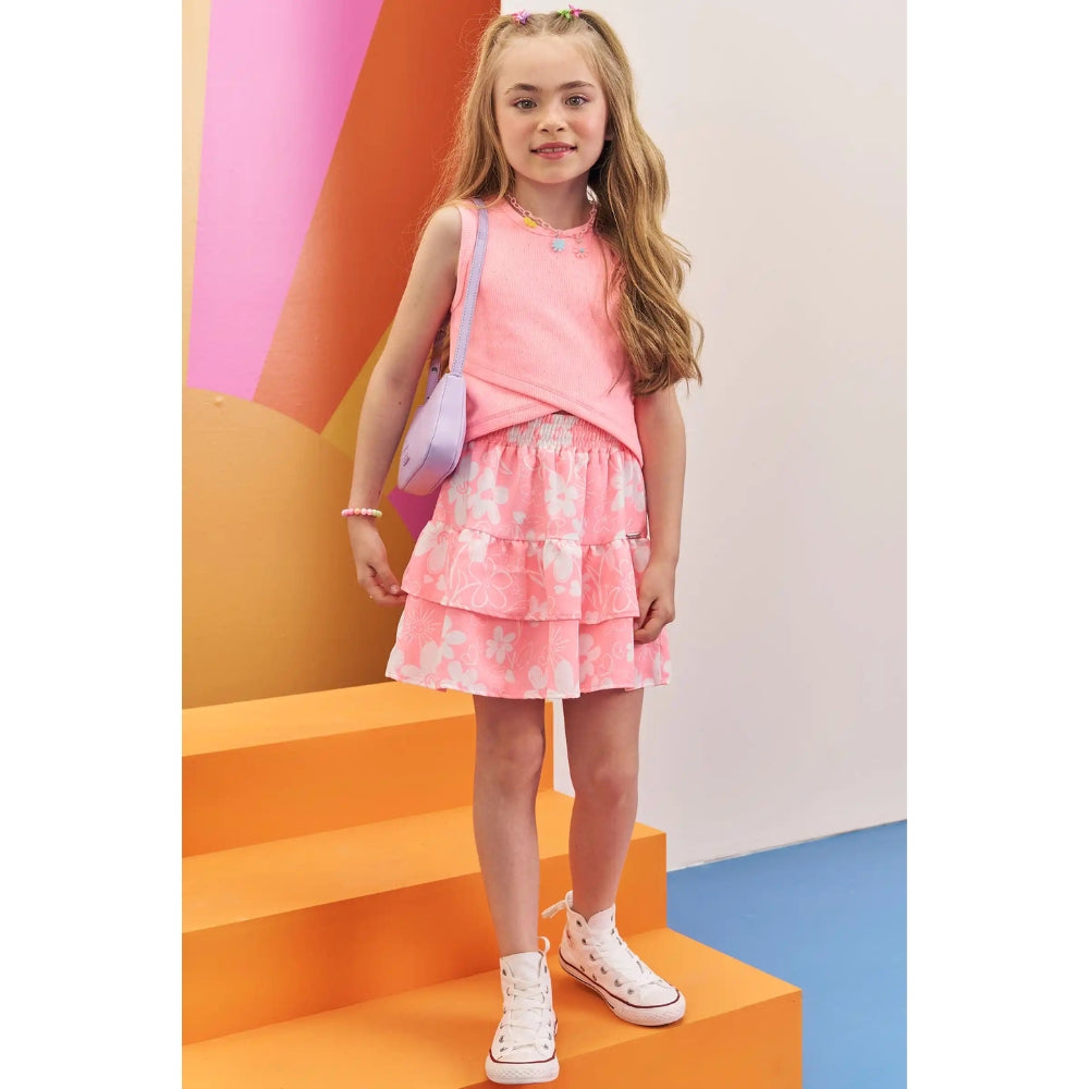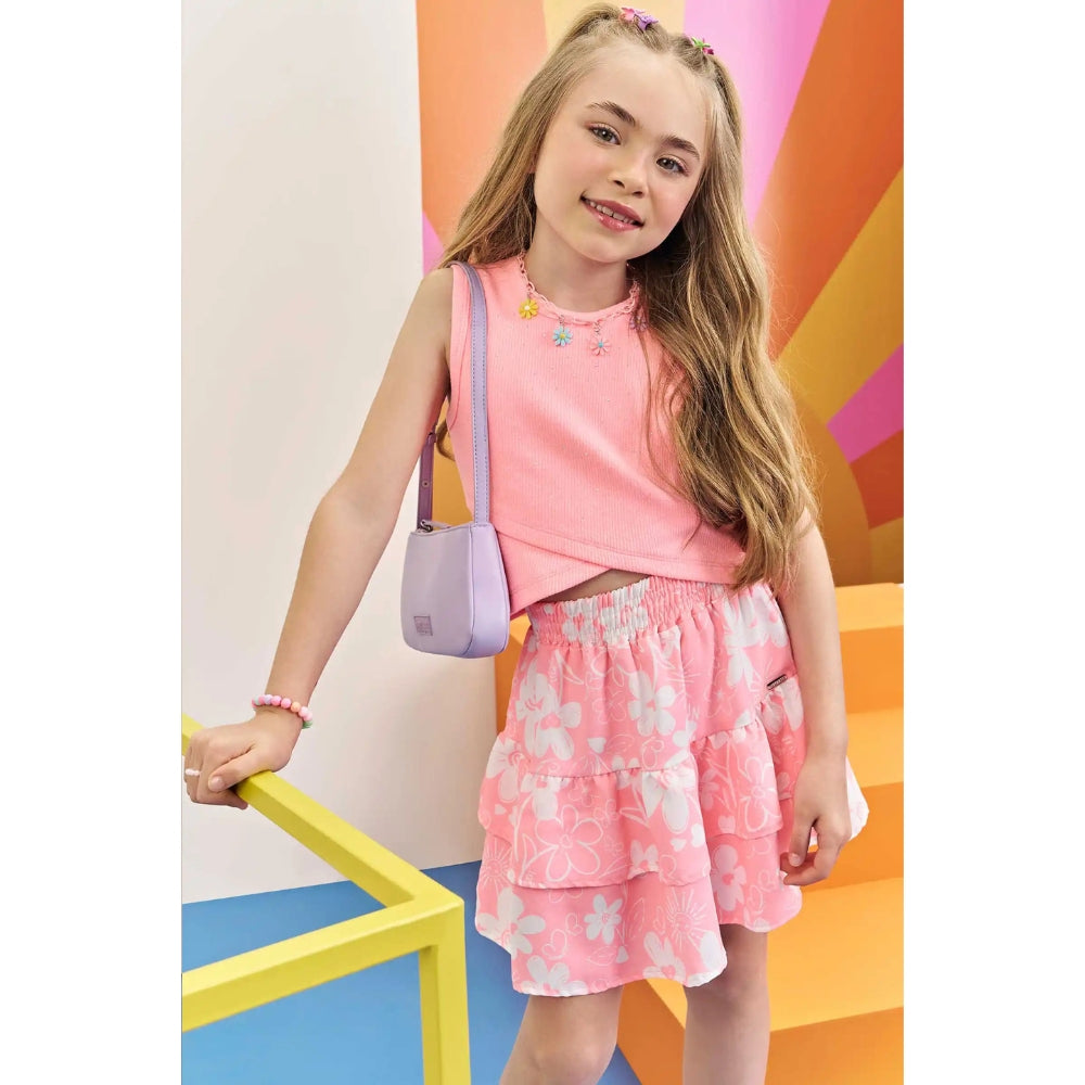 This sweet set includes a pink blouse and a floral print skirt, perfect for a fresh and charming look. Ideal for any special occasion!