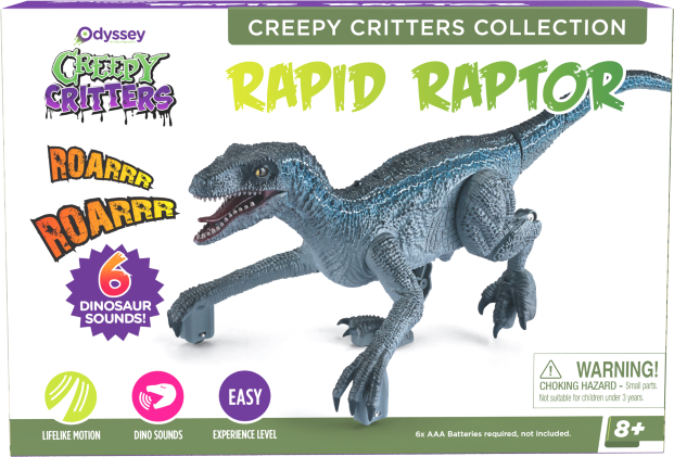 On the prowl, with shockingly real movements! One look will convince any onlooker that a real miniature dinosaur is bearing down on them. With six different sounds at your command, it always has something to say!
