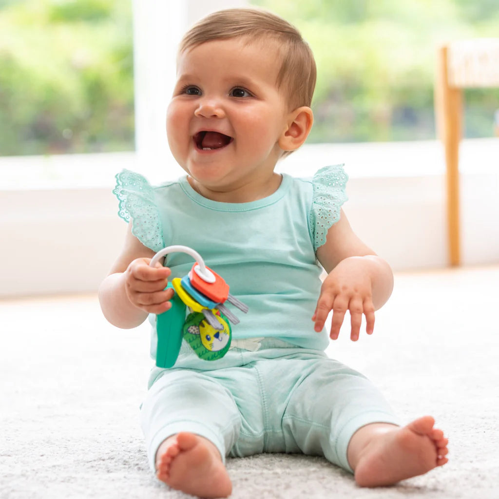 ¡A los bebés les encantará imitar a sus padres con su primer juego de llaves de juguete! Seguro y aprobado por bebés, este realista juego de llaves está fabricado con materiales libres de BPA, ideales para estimular el desarrollo de la motricidad gruesa y fina. ¡Presiona los botones para activar luces y sonidos de coche reales!