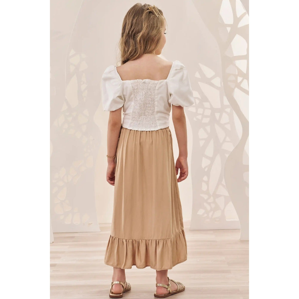 A fresh and charming look that combines a short-sleeved blouse with a khaki skirt. Perfect for any occasion, with style and comfort guaranteed. Ideal for the little ones!