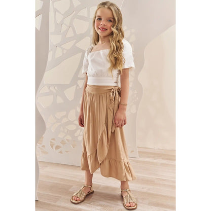 Un look fresco y encantador que combina una blusa de manga corta con una falda khaki. Perfecto para cualquier ocasión, con estilo y comodidad garantizados. ¡Ideal para las más pequeñas!