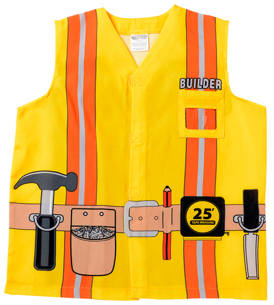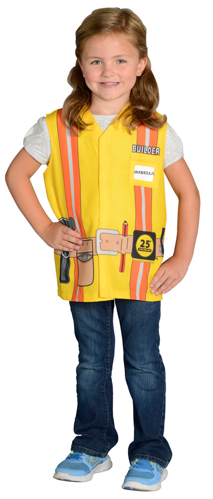 Let’s build something! All the tools you’ll need are printed on the front of this easy on and off vest. The tool belt has hammer, nails, tape measure, pencil and file. “Construction Crew” printed on the back. Pocket on chest for personalization.