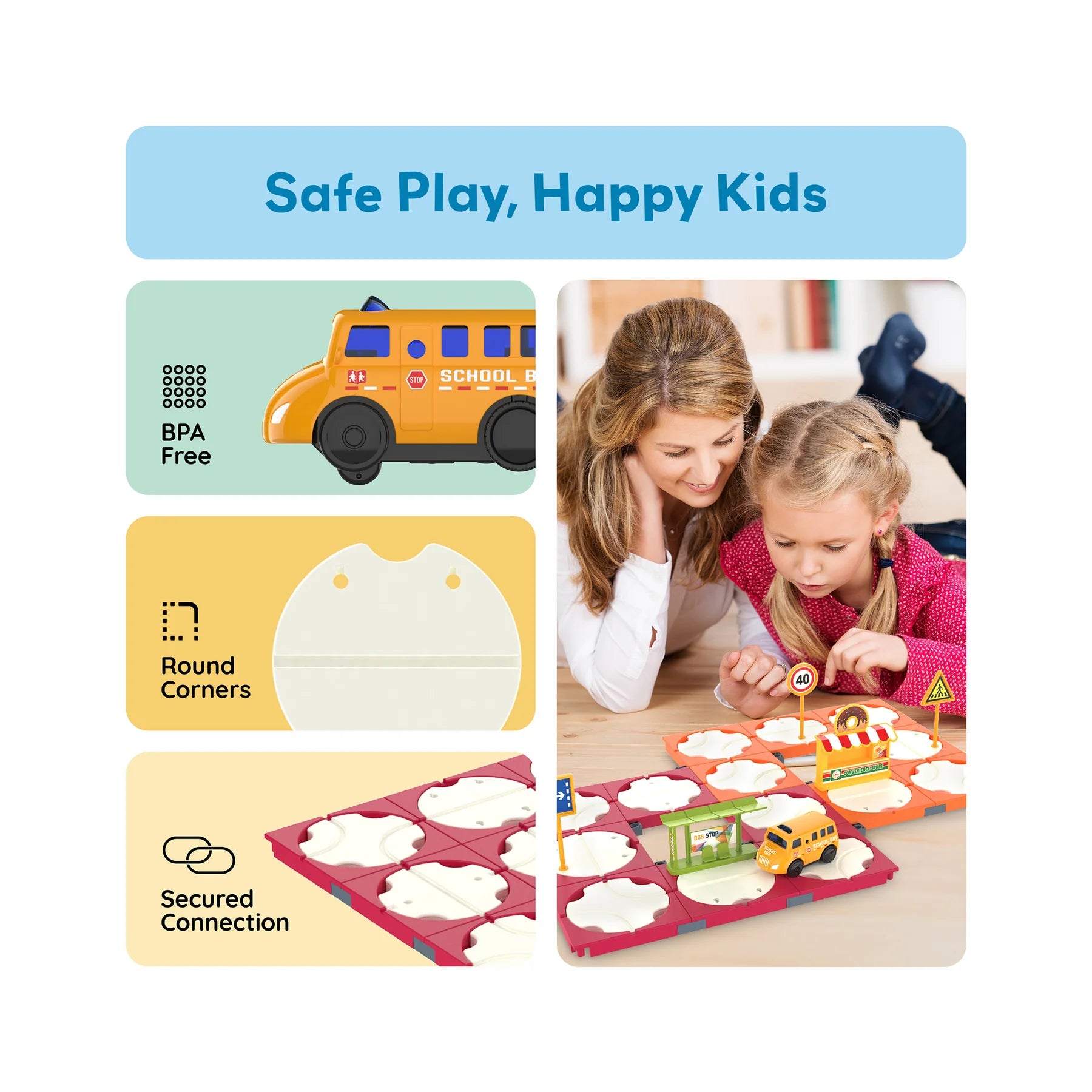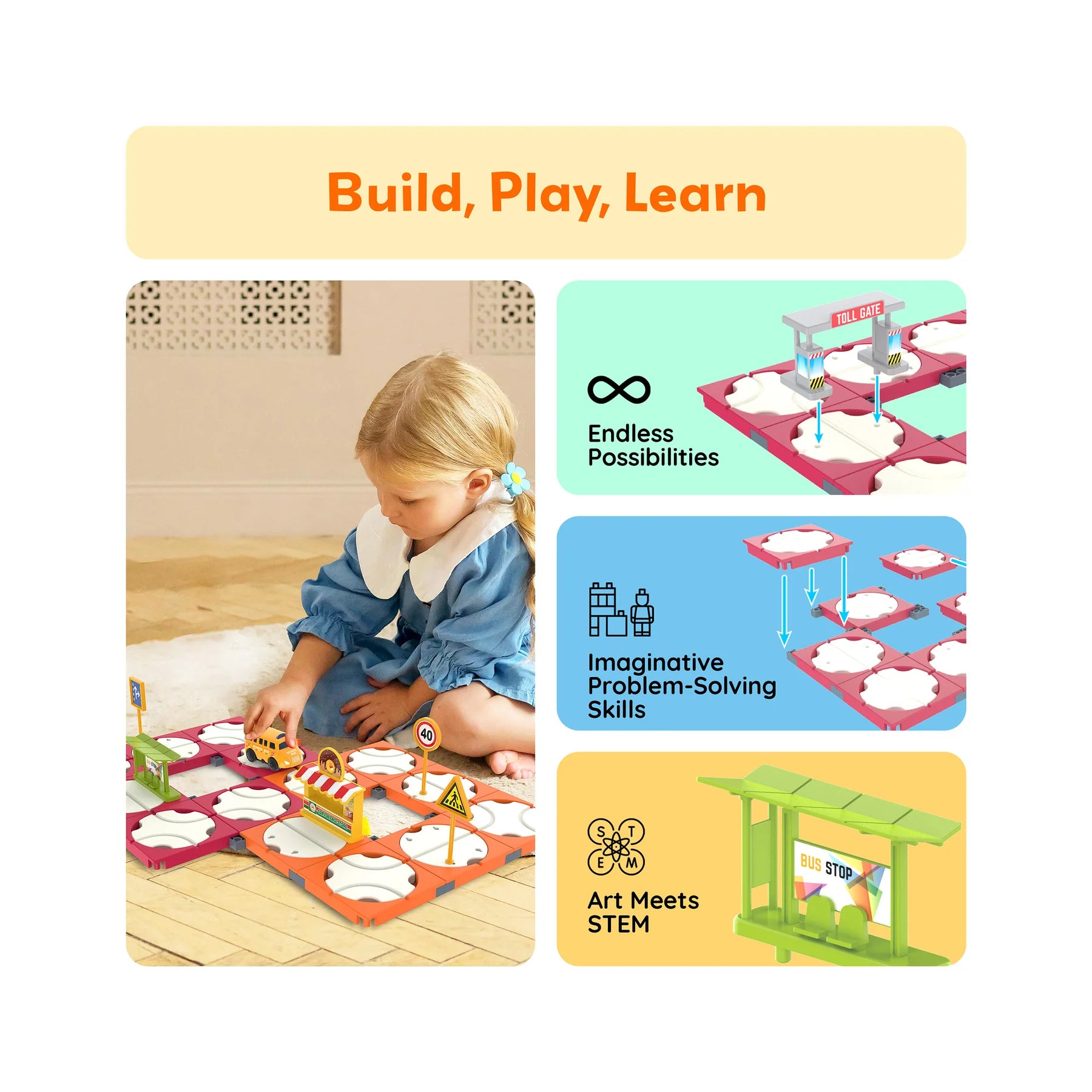 El set de construcción de pistas de coches de carreras PicassoTiles de 60 piezas fomenta el aprendizaje de las ciencias, la tecnología, la ingeniería y las matemáticas (STEM) con pistas fáciles de conectar, un autobús escolar a pilas y accesorios de carretera. Los niños a partir de 3 años pueden diseñar y construir rutas de carreras únicas y escenas urbanas para disfrutar de horas de diversión y desarrollo de habilidades. Pilas no incluidas.