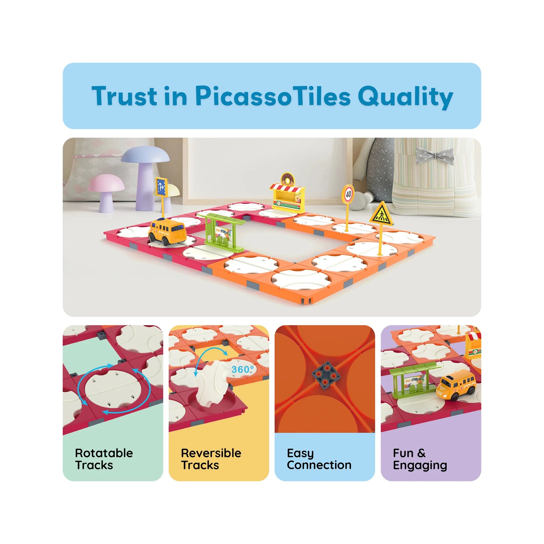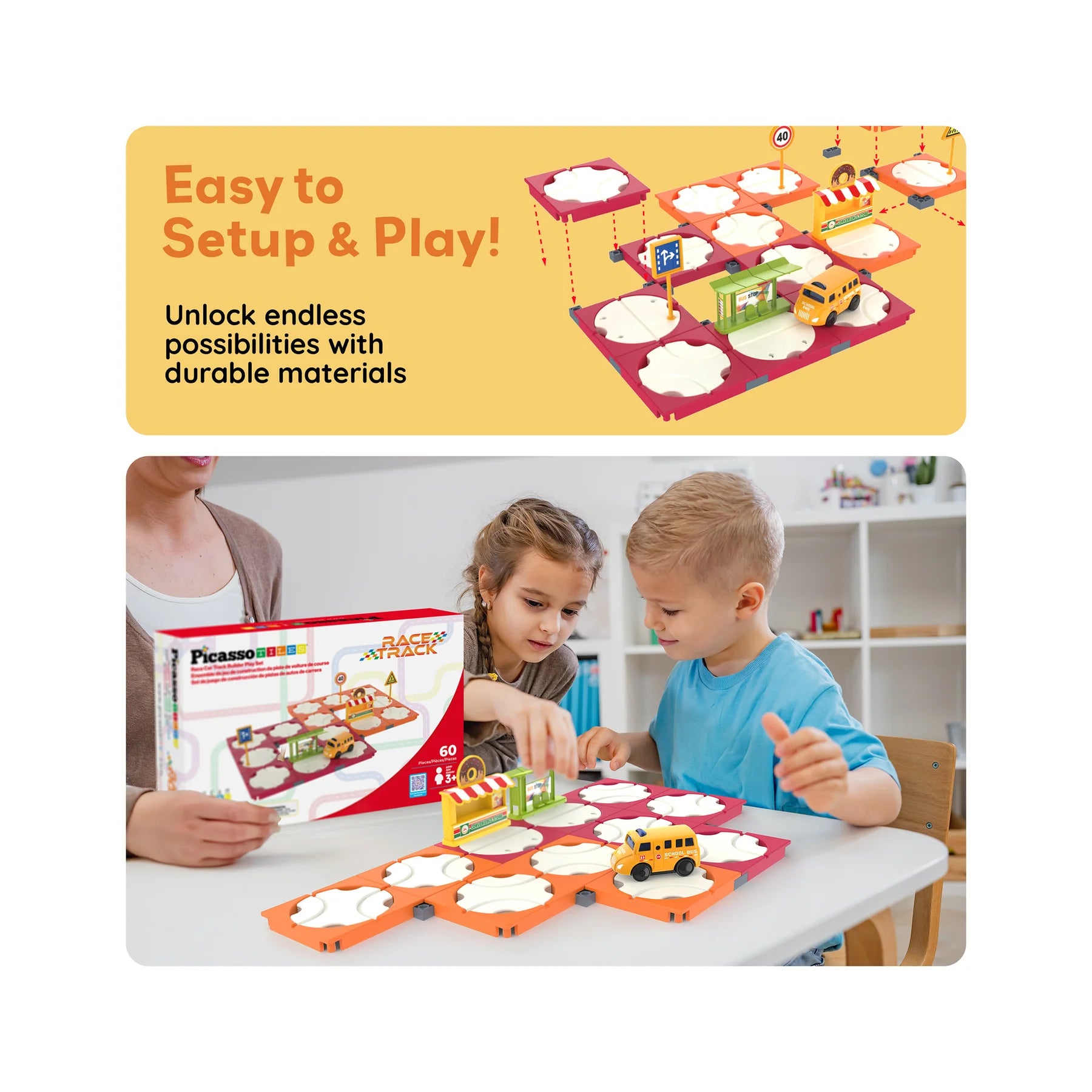 PicassoTiles 60pc Race Car Track Connector Builder Playset encourages STEM learning with easy-connect tracks, a battery-powered school bus, and road accessories. Kids ages 3+ can design and build unique race routes and town scenes for hours of fun and skill-building. Battery not included.