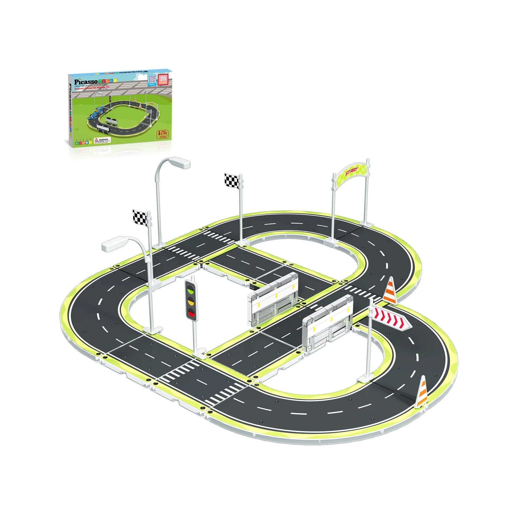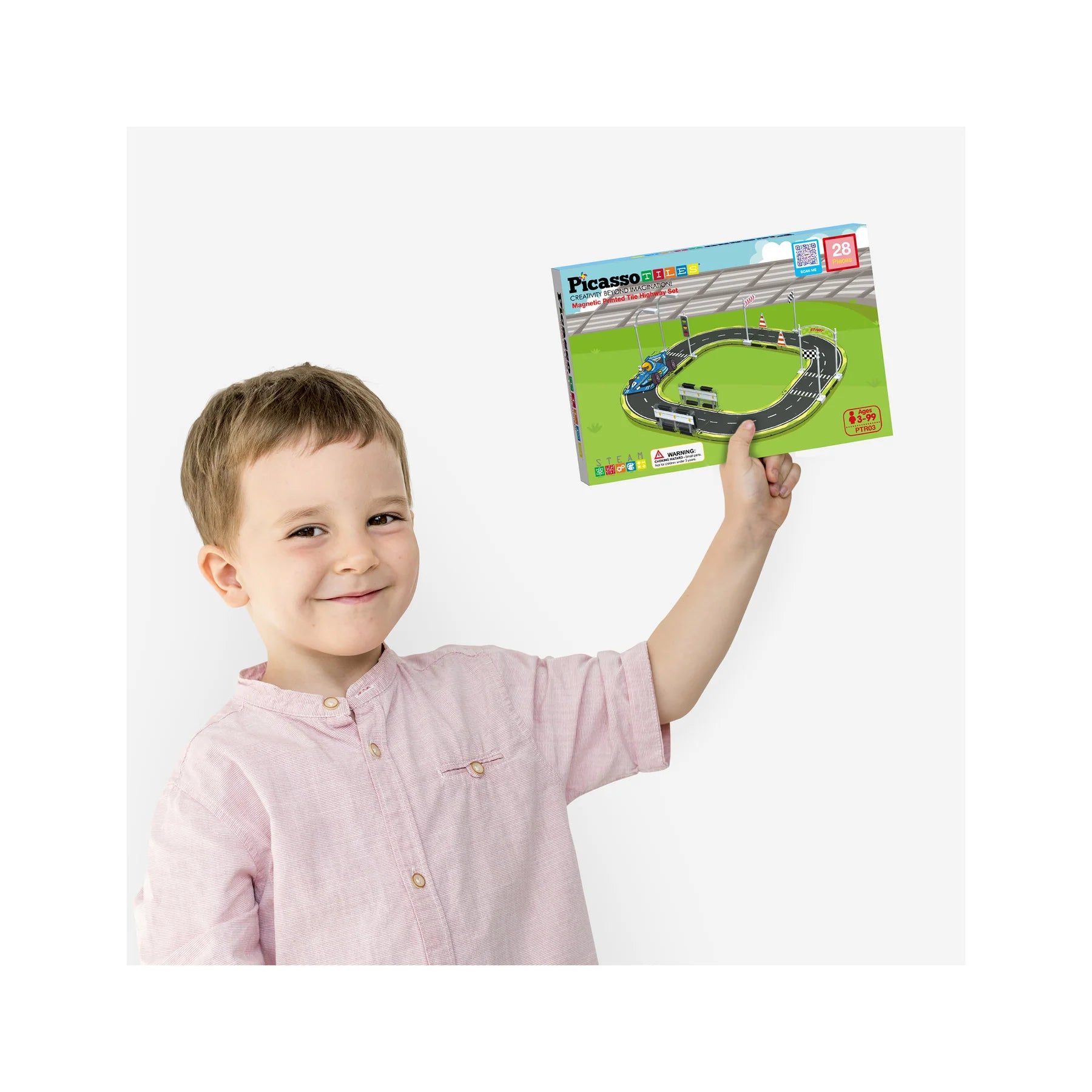 PicassoTiles magnet racetrack tile set with traffic street accessories, greets creativity and imagination for limitless pretend play.