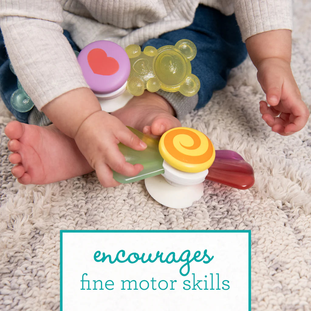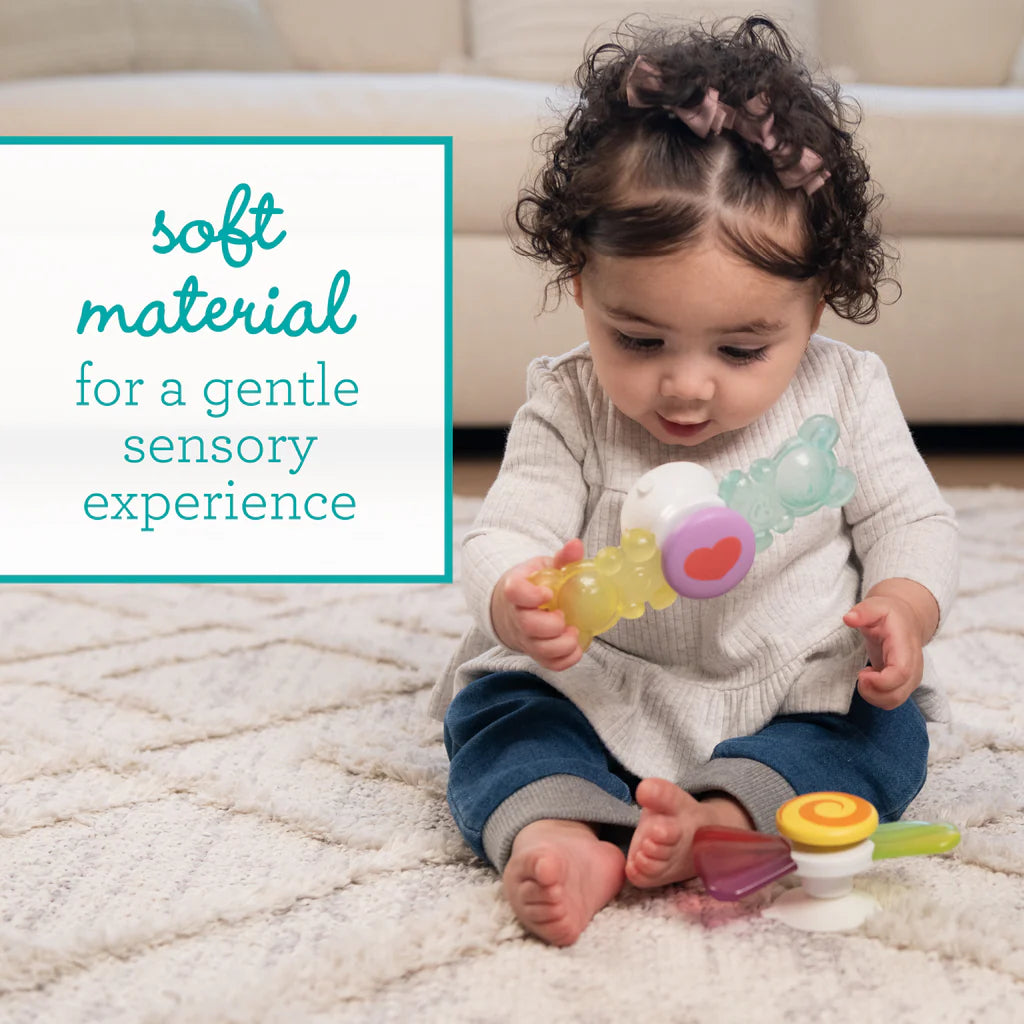Spin up some sweet fun with the Infantino Sweet Treat Spinners! These adorable spinning toys feature soft, textured materials and vibrant candy-inspired designs that are as delightful to touch as they are to watch twirl. Perfectly sized for little hands, they encourage fine motor skills and tactile exploration with every spin and press. The secure suction base sticks to flat surfaces like high chairs or tables, making this a go-to toy for mealtime entertainment or play-anywhere fun. A gentle sensory treat your little one will reach for again and again!